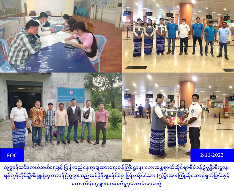 လူမှုဝန်ထမ်း၊ ကယ်ဆယ်ရေးနှင့် ပြန်လည်နေရာချထားရေးဝန်ကြီးဌာန၊ ဘေးအန္တရာယ် ဆိုင်ရာစီမံခန့်ခွဲမှုဦးစီးဌာန၊ ရန်ကုန်တိုင်းဒေသကြီးဦးစီးမှူးရုံးမှ တာဝန်ရှိသူများသည် အင်ဒိုနီးရှားနိုင်ငံ၊ ဘာတန်မြို့ရှိ အဏ္ဍဝါလုပ်ငန်းနှင့် ငါးသယ်ဇာတစခန်းတွင် ထိန်းသိမ်းထား ရှိသည့် မြန်မာနိုင်ငံသား (၅)ဦးအား (၂-၁၁-၂၀၂၃) ရက်နေ့တွင် လေကြောင်းအမှတ်၊ 8M 502 ဖြင့် ကွာလာလမ်ပူ-ရန်ကုန် ခရီးစဉ်အတိုင်း ရန်ကုန်အပြည်ပြည်ဆိုင်ရာလေဆိပ်သို့ (၁၃:၁၅) အချိန်တွင် ရောက်ရှိခဲ့ပါသည်။ အဆိုပါ မြန်မာနိုင်ငံသား(၅)ဦးအား လူဝင်မှုကြီးကြပ်ရေး ဦးစီးဌာန၊ အပြည်ပြည်ဆိုင်ရာလေဆိပ်အဖွဲ့၊ လေကြောင်းရဲတပ်ဖွဲ့၊ လူကုန်တားရဲတပ်ဖွဲ့၊ ကျန်းမာရေးအဖွဲ့၊ သတင်းရဲတပ်ဖွဲ့၊ အထူးစုံစမ်းရေးအဖွဲ့နှင့် ဘေးအန္တရာယ်ဆိုင်ရာစီမံခန့်ခွဲ မှုဦးစီးဌာန ပူးပေါင်းကြိုဆိုဆောင်ရွက်ခဲ့ပါသည်။ အဆိုပါ မြန်မာနိုင်ငံသား (၅)ဦး အနက် ရန်ကုန်တိုင်းဒေသကြီးမှ (၂)ဦး၊ တနင်္သာရီတိုင်းဒေသကြီးမှ (၁)ဦး၊ မွန်ပြည်နယ်မှ (၁)ဦး၊ ရခိုင်ပြည်နယ်မှ (၁)ဦး၊ စုစုပေါင်း (၅)ဦးဖြစ်ပါသည်။ မြန်မာနိုင်ငံသား (၅)ဦးအား ကြိုဆို ဆောင်ရွက်ခြင်းနှင့် ကယ်ဆယ်ရေးပစ္စည်းများဖြစ်သည့် ကျားလုံချည်(၅)ထည်၊ တဘက်(၅) ထည်၊ ဆပ်ပြာ (၅)ထောင့်၊ တီရှပ်(၅)ထည်၊ ခရီးစရိတ်(၁၃၅,၅၀ဝ)ကျပ်နှင့် စားစရိတ် (၁၈,၀၀ဝ)ကျပ်၊ စုစုပေါင်း (၁,၃၇၃,၀၀ဝ)ကျပ်အား ထောက်ပံ့ပေးအပ်ခဲ့ပြီး (၁၇:၀၀) နာရီအချိန်တွင် ရန်ကုန်တိုင်းဒေသကြီးဦးစီးမှူးရုံးမှ ထွက်ခွာ၍ ၎င်းတို့၏နေရပ်အသီသီးသို့ ပြန်လည်ထွက်ခွာခဲ့ပါသည်။