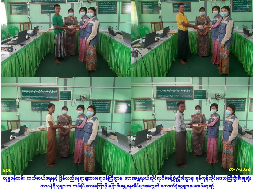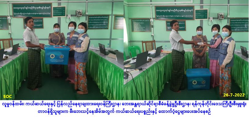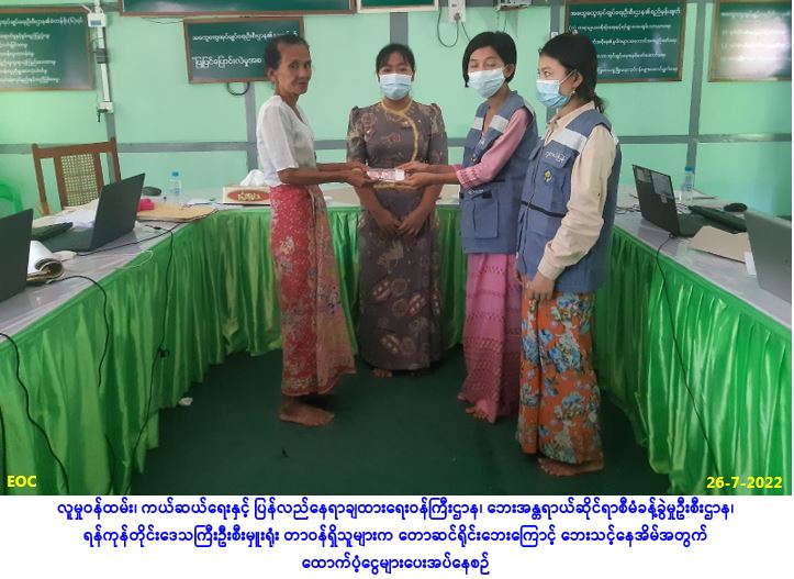 လူမှုဝန်ထမ်း၊ ကယ်ဆယ်ရေးနှင့် ပြန်လည်နေရာချထားရေးဝန်ကြီးဌာန၊ ဘေးအန္တရာယ်ဆိုင်ရာစီမံခန့်ခွဲမှု ဦးစီးဌာန၊ ရန်ကုန်တိုင်းဒေသကြီးဦးစီးမှူးရုံးမှတာဝန်ရှိသူများသည် တိုက်ကြီးခရိုင်၊ တိုက်ကြီးမြို့နယ်၊ ဥက္ကံမြို့၊ အုပ်ပုံကျေးရွာအုပ်စု၊ အုပ်ပုံကျေးရွာ၌ (၂၄-၇-၂၀၂၂) ရက်နေ့တွင် ဖြစ်ပွားခဲ့သော မီးလောင်မှု ကြောင့် ဘေးသင့်အိမ်ခြေ (၁)လုံးအတွက် အိမ်ဆောက်ပစ္စည်းဖိုးထောက်ပံ့ငွေ (၂၀၀,၀၀ဝ/-)၊ လူဦးရေ (၃) ဦးအတွက် ဆန်ရိက္ခာဖိုးထောက်ပံ့ငွေ (၆,၃၀ဝ/-)ကျပ်နှင့် ကယ်ဆယ်ရေးပစ္စည်း (၁၇) မျိုး (၁) အိမ်ထောင် စာတို့အားလည်းကောင်း၊ ဖလုံဘူတာကျေးရွာအုပ်စု၊ ရွှေမြိုင်သာယာကျေးရွာ၌ (၁၈-၇-၂၀၂၂) ရက်နေ့ တွင် တောဆင်ရိုင်းဝင်ရောက်မှုကြောင့် ဘေးသင့်အိမ်ခြေ (၁)လုံးအတွက် အိမ်ဆောက်ပစ္စည်းဖိုး ထောက်ပံ့ငွေ (၅၀,၀၀ဝ/-)၊ လူဦးရေ (၇)ဦးအတွက် ဆန်ရိက္ခာဖိုးထောက်ပံ့ငွေ (၁၄,၇၀ဝ/-)ကျပ်တို့အား လည်းကောင်း၊ အဖျောက်မြို့၊ အုန်းပင်ကွင်းကျေးရွာအုပ်စု၊ ရေပြန်အရှေ့ကျေးရွာ၌ (၂၀-၇-၂၀၂၂) ရက်နေ့ တွင် မြစ်ကမ်းပါးပြိုကျမှုကြောင့် ပြောင်းရွှေ့အိမ်ခြေ (၁)လုံးအတွက် အိမ်ဆောက်ပစ္စည်းဖိုးထောက်ပံ့ငွေ (၁၀၀,၀၀ဝ/-)၊ လူဦးရေ(၇)ဦးအတွက် ဆန်ရိက္ခာဖိုးထောက်ပံ့ငွေ (၁၄,၇၀ဝ/-)ကျပ်တို့အား လည်းကောင်း၊ အဖျောက်မြို့၊ အုန်းပင်ကွင်းကျေးရွာအုပ်စု၊ ရေပြန်အရှေ့ကျေးရွာ၌ (၂၀-၇-၂၀၂၂) ရက်နေ့တွင် မြစ်ကမ်း ပါးပြိုကျမှုကြောင့် ပြောင်းရွှေ့အိမ်ခြေ (၃)လုံးအတွက် အိမ်ဆောက်ပစ္စည်းဖိုးထောက်ပံ့ငွေ (၃၀၀,၀၀ဝ/-)၊လူဦးရေ (၈)ဦးအတွက် ဆန်ရိက္ခာဖိုးထောက်ပံ့ငွေ (၁၆,၈၀ဝ/-)ကျပ်နှင့် အဖျောက်မြို့၊ ရေပေါ်သောင် ကျေးရွာ၌ (၂၅-၇-၂၀၂၂)ရက်နေ့တွင် မြစ်ကမ်းပါးပြိုကျမှုကြောင့် ပြောင်းရွှေ့ အိမ်ခြေ (၁)လုံးအတွက် အိမ်ဆောက်ပစ္စည်းဖိုးထောက်ပံ့ငွေ (၁၀၀,၀၀ဝ/-)၊ လူဦးရေ (၆)ဦးအတွက် ဆန်ရိက္ခာဖိုးထောက်ပံ့ငွေ (၁၂,၆၀၀/-)ကျပ်တို့အားလည်းကောင်း (၂၇-၇-၂၀၂၂)ရက်နေ့၊ (၁၃း၀၀)နာရီ အချိန်တွင် တိုက်ကြီးမြို့နယ် အထွေထွေအုပ်ချုပ်ရေးဦးစီးဌာနမှ တာဝန်ရှိသူများနှင့်အတူ ပြည်သူများ၏ လက်ဝယ်အရောက် ထောက်ပံ့ပေးအပ်ခဲ့ကြောင်း သတင်းရရှိပါသည်။