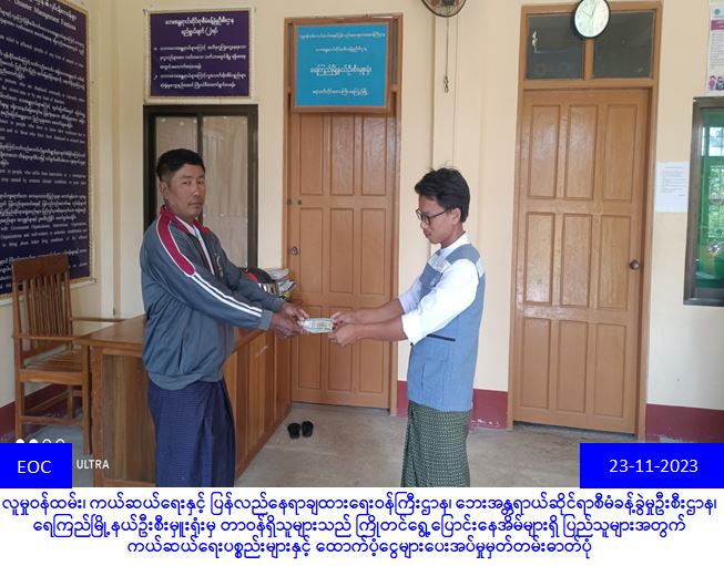 လူမှုဝန်ထမ်းကယ်ဆယ်ရေးနှင့် ပြန်လည်နေရာချထားရေးဝန်ကြီးဌာန၊ ဘေးအန္တရာယ် ဆိုင်ရာ စီမံခန့်ခွဲမှုဦးစီးဌာန၊ ရေကြည်မြို့နယ်ဦးစီးမှုးရုံးမှ တာဝန်ရှိသူများသည် ရေကြည် မြို့နယ်၊ ကွင်းလျားကျေးရွာအုပ်စု၊ ဘုရားကုန်းကျေးရွာတွင် (၂၁-၁၁-၂၀၂၃)ရက်နေ့တွင် ဖြစ် ပွားသောကမ်း ပြိုဘေးကြောင့် ကြိုတင်ဖျက်သိမ်းပြောင်းရွေ့ခဲ့ရသည့် နေအိမ် (၄)လုံးအတွက် အိမ်ဆောက်ပစ္စည်းဖိုးရန်ပုံငွေ (၄၀၀၀၀ဝ/-)ကျပ်၊ အိမ်ထောင်စု (၄) စုမှ စုစုပေါင်း လူဦးရေ (၁၂) ဦးအတွက် ဆန်ရိက္ခာ (၇) ရက်စာ ရန်ပုံငွေ (၂၅၂၀၀/-)ကျပ်၊ စုစုပေါင်းကယ်ဆယ်ရေး ရန်ပုံငွေ (၄၂၅၂၀၀/-) ကျပ်အား (၂၃-၁၁-၂၀၂၃) ရက်နေ့ (၁၆:၃၀)နာရီအချိန်တွင် တာဝန်ရှိသူ များရှေ့မှောက်၌ ဘေးသင့်ပြည်သူများထံ လက်ဝယ်အရောက် ထောက်ပံ့ပေးအပ်ခဲ့ပါသည်။