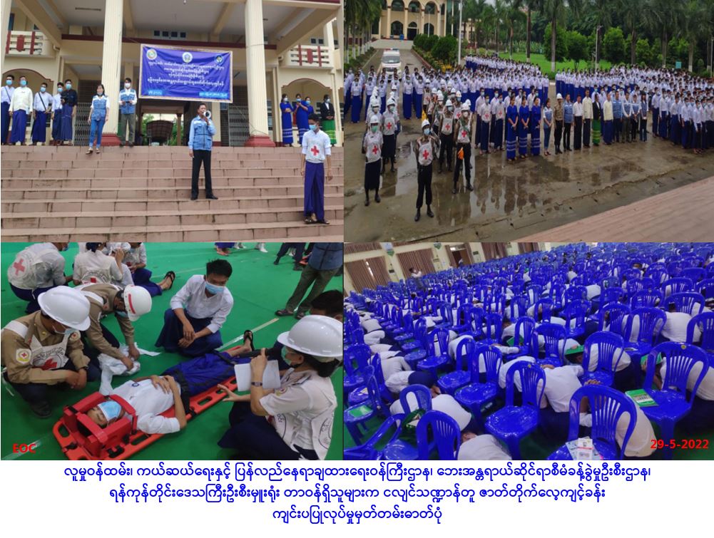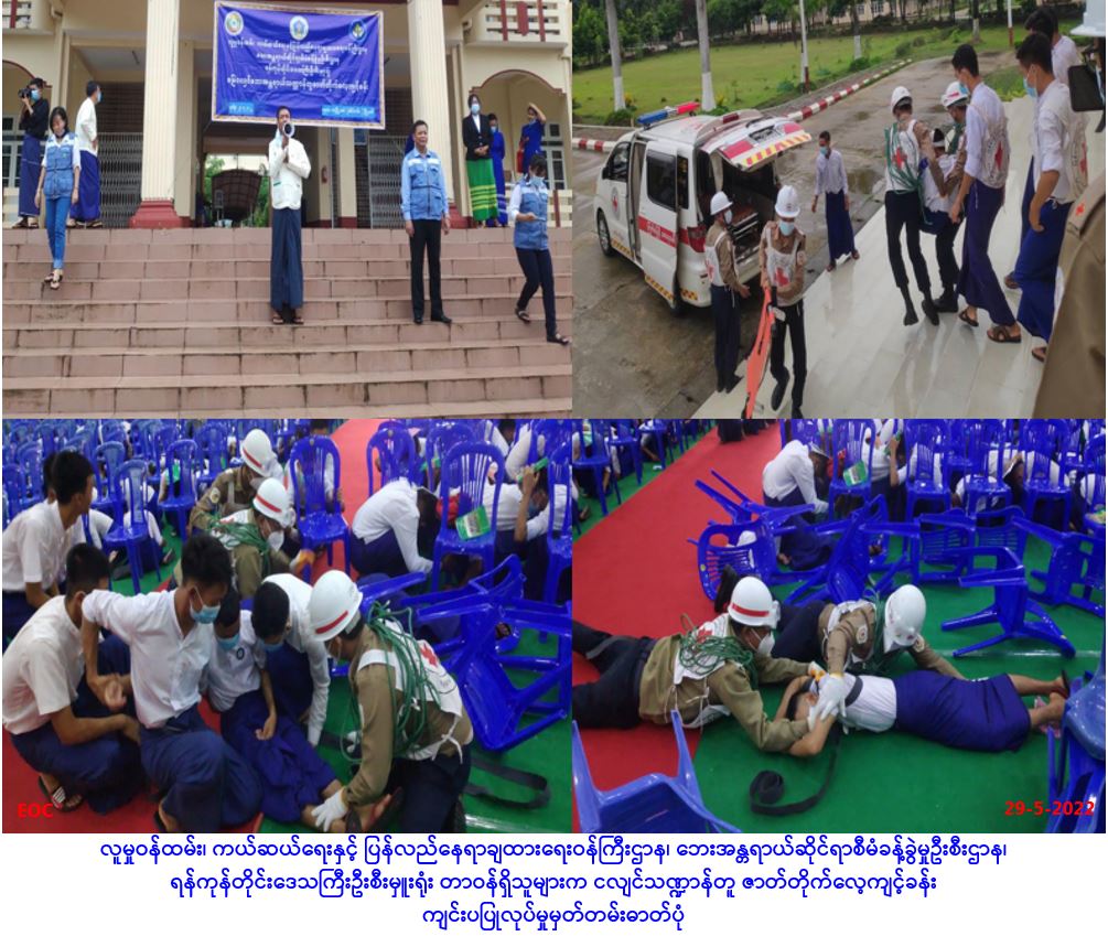 လူမှုဝန်ထမ်း၊ ကယ်ဆယ်ရေးနှင့် ပြန်လည်နေရာချထားရေးဝန်ကြီးဌာန၊ ဘေးအန္တရာယ်ဆိုင်ရာစီမံခန့်ခွဲမှု ဦးစီးဌာန၊ ရန်ကုန်တိုင်းဒေသကြီးဦးစီးမှူးရုံးမှ တာဝန်ရှိသူများသည် ရန်ကုန်တိုင်းဒေသကြီး၊ အရှေ့ပိုင်း ခရိုင်၊ ဒဂုံမြို့သစ်(ဆိပ်ကမ်း) မြို့နယ်ရှိ နယ်စပ်ရေးရာဝန်ကြီးဌာန၊ တိုင်းရင်းသားလူငယ်များ စွမ်းရည် ဖွံ့ဖြိုးရေးဒီဂရီကောလိပ်တွင် (၂၉-၅-၂၀၂၂) ရက်နေ့တွင် ကျင်းပပြုလုပ်သည့် "မြေငလျင်ဘေးအန္တရာယ် သဏ္ဍာန်တူဇာတ်တိုက်လေ့ကျင့်ခန်း" ကို ဘေးအန္တရာယ်ဆိုင်ရာစီမံခန့်ခွဲမှုဦးစီးဌာန၊ ပြည်ထောင်စု တိုင်းရင်းသားလူငယ်များစွမ်းရည်ဖွံ့ဖြိုးရေးဒီဂရီကောလိပ် (ရန်ကုန်) နှင့် မြန်မာနိုင်ငံကြက်ခြေနီ တပ်ဖွဲ့ဝင်များ စုစုပေါင်းအင်အား (၉၈၈) ဦးဖြင့် ပူပေါင်းဆောင်ရွက်ခဲ့ပါကြောင်း သတင်းရရှိပါသည်။