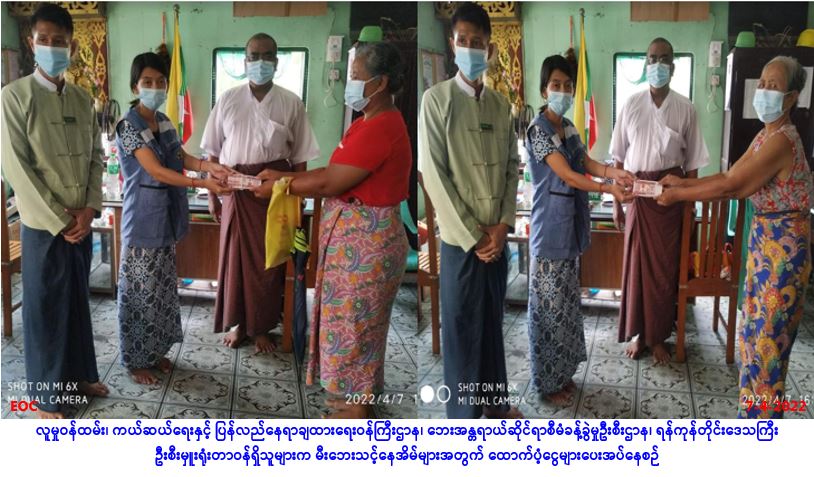 လူမှုဝန်ထမ်း၊ ကယ်ဆယ်ရေးနှင့် ပြန်လည်နေရာချထားရေးဝန်ကြီးဌာန၊ ဘေးအန္တရာယ်ဆိုင်ရာစီမံခန့်ခွဲမှုဦးစီးဌာန၊ ရန်ကုန်တိုင်းဒေသကြီးဦးစီးမှူးရုံးမှ တာဝန်ရှိသူများသည် ရန်ကုန်တိုင်းဒေသကြီး၊ မရမ်းကုန်းမြို့နယ်၊ အမှတ်(၃) ရပ်ကွက်၊ မရမ်းစု၊ ကြည်စေတနာလမ်းတွင်(၂၈-၃-၂၀၂၂)ရက်နေ့( ၀၉း၀၀)နာရီအချိန်တွင် ဖြစ်ပွားခဲ့သော မီးဘေး ကြောင့် ဘေးသင့်လုံးဝပျက်စီးအိမ်ခြေ (၆)လုံး၊ အိမ်ထောင်စု(၆)စုမှ လူဦးရေ (၃၀)ဦးတို့အတွက် ဆန်ရိက္ခာ ဖိုးထောက်ပံ့ငွေ (၆၃,၀၀ဝ/-)၊ ကယ်ဆယ်ရေးပစ္စည်း (၁၇)မျိုး (၆)အိမ်ထောင်စုစာနှင့် ကိုဗစ်-၁၉ ကြိုတင် ကာကွယ်ဖို့ အိမ်ထောင်စု (၆) စုအတွက် ဆပ်ပြာ (၆)တောင့်၊ လူဦးရေ (၃၀)ဦးအတွက် mask (၆၀) ခုတို့အား မရမ်းကုန်းမြို့နယ် အထွေထွေအုပ်ချုပ်ရေးဦးစီးဌာနမှ တာဝန်ရှိသူများနှင့်အတူ (၂၈-၃-၂၀၂၂)ရက်နေ့ (၁၁:၀၀) နာရီအချိန်တွင် သွားရောက်ထောက်ပံ့ခဲ့ပြီး ယခုအခါထပ်မံ၍ ထောက်ပံ့ရန်ကျန်ရှိသော အိမ်ဆောက်ပစ္စည်းဖိုး ထောက်ပံ့ငွေ ကျပ် (၁,၂၀၀,၀၀၀/-)ကျပ်အား မရမ်းကုန်းမြို့နယ်အထွေထွေအုပ်ချုပ်ရေးဦးစီးဌာနမှ တာဝန်ရှိသူ များနှင့်အတူ (၇-၄-၂၀၂၂)ရက်နေ့ (၁၅:၀၀)နာရီအချိန်တွင် သွားရောက်ထောက်ပံ့ပေးအပ်ခဲ့ကြောင်း သတင်း ရရှိပါသည်။