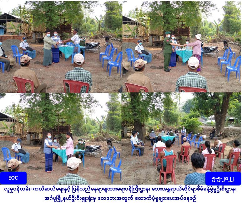 လူမှုဝန်ထမ်း၊ ကယ်ဆယ်ရေးနှင့်ပြန်လည်နေရာချထားရေးဝန်ကြီးဌာန၊ ဘေးအန္တရာယ်ဆိုင်ရာစီမံ ခန့်ခွဲမှုဦးစီးဌာန၊ အင်္ဂပူမြို့နယ် ဦးစီးမှူးရုံးမှ တာဝန်ရှိသူများသည် အင်္ဂပူမြို့၊ ဝက်လဟာ ကျေးရွာအုပ်စု၊ ကညင်တပင်ကျေးရွာတွင် (၄-၅-၂၀၂၂) ရက်နေ့ ဖြစ်ပွားသော ကမ်းပြိုဘေးကြောင့် ကြိုတင်ရွှေပြောင်းအိမ်ခြေ (၁၄) လုံး၊ အိမ်ထောင်စု (၁၄)စုရှိ လူဦးရေ (၅၁)ဦးတို့အတွက် အိမ်ဆောက်ပစ္စည်းဖိုးကျပ် (၁၄၀၀၀၀ဝ/-)ကျပ်၊ ဆန်ရိက္ခာဖိုးကျပ်(၁၀၇၁၀ဝ/-)ကျပ်၊ စုစုပေါင်း ထောက်ပံ့ရန်ပုံငွေကျပ် (၁၅၀၇၁၀ဝ/-)ကျပ် တိတိနှင့် Surgical Mask (၁၀၂) ခုတို့ကို မြို့နယ်စီမံအုပ်ချုပ်ရေးအဖွဲ့ ဥက္ကဌ၊ အတွင်းရေးမှူး၊ အဖွဲ့ဝင် (၁) များနှင့်အတူ (၁၅:၃၀) နာရီတွင် ဘေးဖြစ်ပွားရာကျေးရွာအုပ်စုသို့သွားရောက်၍ ဘေးသင့်ပြည်သူများလက်၀ယ်သို့ အရောက် ပေးပို့ထောက်ပံ့ပေးအပ်ခဲ့ပါသည်။