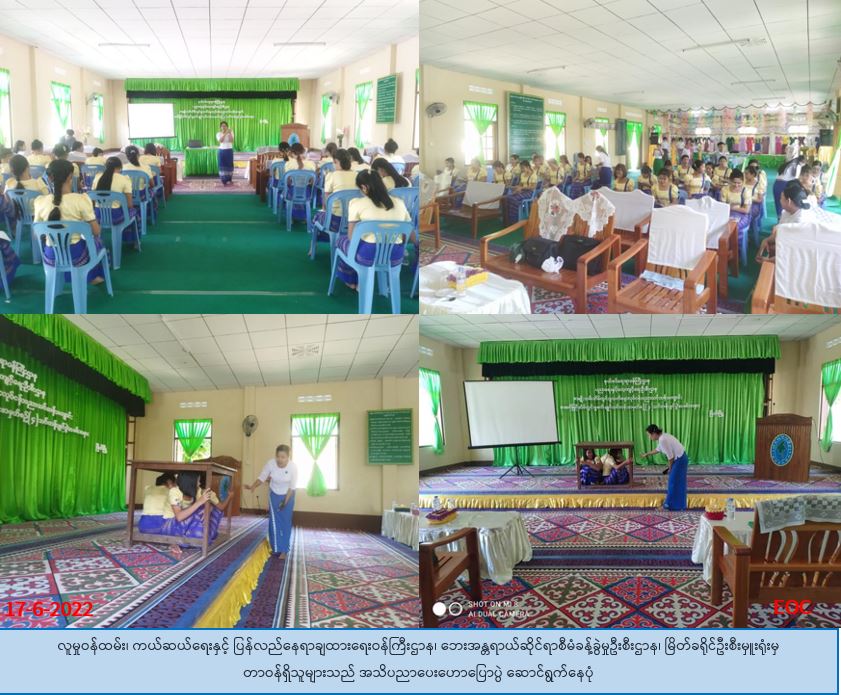 လူမှုဝန်ထမ်း၊ ကယ်ဆယ်ရေးနှင့် ပြန်လည်နေရာချထားရေးဝန်ကြီးဌာန၊ ဘေးအန္တရာယ်ဆိုင်ရာ စီမံခန့်ခွဲမှုဦးစီးဌာန၊ (၁၇.၆.၂၀၂၂)ရက်နေ့၊ ဘေးအန္တရာယ်ဆိုင်ရာ စီမံခန့်ခွဲမှုဦးစီးဌာန၊ မြိတ်ခရိုင်ဦးစီးမှူးရုံးမှ တာဝန်ရှိသူများသည် နယ်စပ်ရေးရာဝန်ကြီးဌာန၊ ပညာရေးနှင့်လေ့ကျင့်ရေး ဦးစီးဌာန၊ အမျိုးသမီးအိမ်တွင်းမှု သက်မွေးလုပ်ငန်းပညာသင်တန်းကျောင်း၊ အဆင့်မြင့်အိမ်တွင်းမှု စက်ချုပ်သင်တန်းကျောင်း အမှတ်စဉ်(၄) သင်တန်းဆင်းပွဲအခမ်းအနားတွင် သဘာဘေးအသိပညာ ပေးဟောပြောခြင်း၊ လက်ကမ်းစာစောင်များဖြန့်ဝေခြင်းနှင့် သရုပ်ပြဆောင်ရွက်ခြင်းများ သွားရောက် ဆောင်ရွက်ခဲ့ပါသည်။