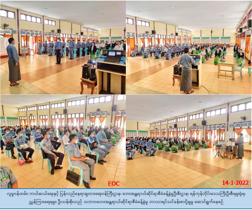 လူမှုဝန်ထမ်း၊ ကယ်ဆယ်ရေးနှင့် ပြန်လည်နေရာချထားရေးဝန်ကြီးဌာန၊ ဘေးအန္တရာယ်ဆိုင်ရာစီမံခန့်ခွဲမှု ဦးစီးဌာန၊ ရန်ကုန်တိုင်းဒေသကြီးဦးစီးမှူးရုံးမှ ညွှန်ကြားရေးမှူး၊ ဦးသန်းစိုးသည် (၁၄-၁-၂၀၂၂ )ရက်နေ့ (၁၂:၅၀) နာရီမှ (၁၆:၀၀)နာရီအထိ နယ်စပ်ရေးရာဝန်ကြီးဌာန၊ ဗဟိုလေ့ကျင့်ရေးသင်တန်းကျောင်း (ရန်ကုန်မြို့)၌ သင်တန်းသား၊ သင်တန်းသူ စုစုပေါင်း( ၇၆ ) ဦးအား သဘာဝဘေးအန္တရာယ်ဆိုင်ရာ စီမံခန့်ခွဲမှုဘာသာရပ်သင်ခန်းစာအား ပို့ချခဲ့ပါသည်။