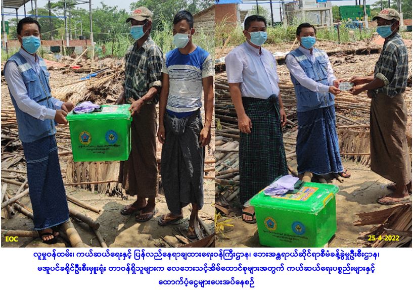 လူမှုဝန်ထမ်း၊ ကယ်ဆယ်ရေးနှင့် ပြန်လည်နေရာချထားရေးဝန်ကြီးဌာန၊ ဘေးအန္တရာယ်ဆိုင်ရာစီမံခန့်ခွဲမှု ဦးစီးဌာန၊ မအူပင်ခရိုင်ဦးစီးမှူးရုံးမှ တာဝန်ရှိသူများသည် မအူပင်မြို့နယ်၊ တော်တလုပ်ကျးရွာအုပ်စု၊ သုံးခွဆိုင်ကျေးရွာ၌ (၂၄-၄-၂၀၂၂)ရက်နေ့တွင် ဖြစ်ပွားခဲ့သော လေပြင်းဘေးကြောင့် ဘေးသင့်ခဲ့သည့် ပြိုကျနေအိမ် (၃)လုံး၊ အိမ်ထောင်စု(၃)စုမှ လူဦးရေ (၉)ဦးအတွက် ကယ်ဆယ်ရေးပစ္စည်း (၁၈)မျိုးပါ( ၃) ပုံးနှင့် Surgical Mask (၁၈)ခု အိမ်ဆောက်ပစ္စည်းဖိုးထောက်ပံ့ငွေ (၃၀၀,၀၀၀/-)၊ ဆန်ရိက္ခာဖိုးထောက်ပံ့ ငွေ (၁၈,၉၀၀/-) ကျပ်၊ စုစုပေါင်းထောက်ပံ့ငွေ (၃၁၈,၉၀၀/-) ကျပ်တို့အား မြို့နယ် အထွေထွေ အုပ်ချုပ်ရေးဦးစီးဌာနမှ တာဝန်ရှိသူများနှင့်အတူ (၂၅-၄-၂၀၂၂) ရက်နေ့၊ (၁၂း၅၅) နာရီအချိန်တွင် ဘေးသင့်ပြည်သူ များ၏ လက်ဝယ်အရောက် ကွင်းဆင်းထောက်ပံ့ပေးအပ်ခဲ့ကြောင်း သတင်းရရှိပါသည်။