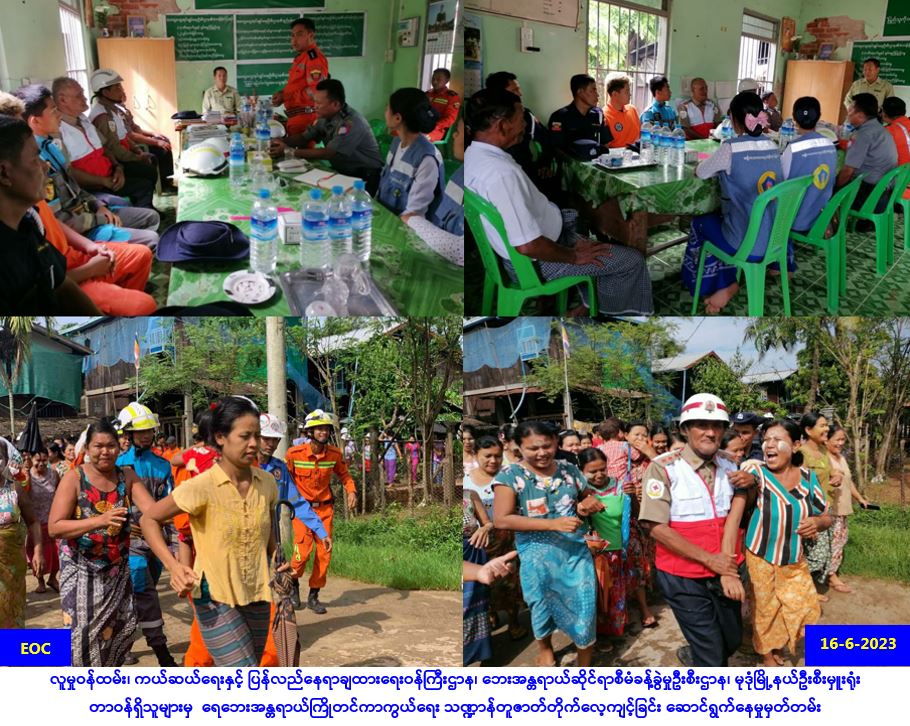 လူမှုဝန်ထမ်း၊ ကယ်ဆယ်ရေးနှင့် ပြန်လည်နေရာချထားရေးဝန်ကြီးဌာန၊ ဘေးအန္တရာယ်ဆိုင်ရာစီမံခန့်ခွဲမှုဦးစီးဌာန၊ မုဒုံမြို့နယ်ဦးစီးမှူးရုံးမှ ဦးဆောင်၍ မြို့နယ်သဘာဝဘေးအန္တရာယ်စီမံခန့်ခွဲမှုကော်မတီဝင်၊ မြို့နယ်မီးသတ်ဦးစီးဌာန၊ မြို့နယ်ကြက်ခြေနီအသင်းခွဲနှင့် မြို့နယ်လူမှု ကယ်ဆယ်ရေးအသင်းအဖွဲ့တို့ ပူးပေါင်းပြီး (၁၆-၆-၂၀၂၃)ရက်နေ့၊ (၀၈းဝဝ)အချိန်မှ(၁၀း၀၀)နာရီအချိန်အထိ မုဒုံမြို့နယ်၊ ကတုံးပေါ် ကျေးရွာ၌ ရေဘေးအန္တရာယ်ကြိုတင် ကာကွယ်ရေးသဏ္ဍာန်တူ ဇာတ်တိုက်လေ့ကျင့်ခြင်းအား ပြည်သူလူထု (၁၅၀)ဦးတို့ဖြင့် ဆောင်ရွက်ခဲ့ပါသည်။