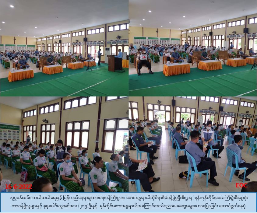 လူမှုဝန်ထမ်း၊ ကယ်ဆယ်ရေးနှင့် ပြန်လည်နေရာချထားရေးဝန်ကြီးဌာန၊ ဘေးအန္တရာယ်ဆိုင်ရာ စီမံခန့်ခွဲမှုဦးစီးဌာန၊ ရန်ကုန်တိုင်းဒေသကြီးဦးစီးမှူးရုံးမှ တာဝန်းရှိသူများသည် (၁၆-၆-၂၀၂၂) ရက်နေ့တွင် နယ်စပ်ရေးရာဝန်ကြီးဌာန၊ ပညာရေးနှင့်လေ့ကျင့်ရေးဦးစီးဌာန၊ ဗဟိုလေ့ကျင့်ရေး သင်တန်းကျောင်း၊ ရန်ကုန်မြို့၌ သင်တန်းသား၊ သင်တန်းသူ (၇၃)ဦး၊ သင်တန်းကျောင်းမှ အမှုထမ်း၊ အရာထမ်း (၁၀၃)ဦး၊ မြန်မာနိုင်ငံကြက်ခြေနီတပ်ဖွဲ့မှ (၂၀)ဦး၊ တိုင်းဒေသကြီးဦးစီးမှူးရုံး၊ ခရိုင်ရုံး (၉)ဦး၊ စုစုပေါင်းအင်အား(၁၈၅)ဦးတို့အား မုန်တိုင်းဘးအန္တရာယ်အကြာင်း အသိပညာပေး ဆွေးနွေးဟောပြောခြင်း ဆောင်ရွက်ခဲ့ပါသည်။