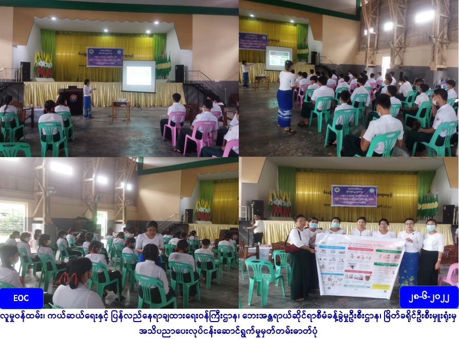 လူမှုဝန်ထမ်း၊ ကယ်ဆယ်ရေးနှင့်ပြန်လည်နေရာချထားရေးဝန်ကြီးဌာန၊ ဘေးအန္တရာယ်ဆိုင်ရာစီမံခန့်ခွဲမှုဦးစီးဌာန၊ မြိတ်ခရိုင် ဦးစီးမှူးရုံးမှ တာဝန်ရှိသူများသည် (၂၈.၆.၂၀၂၂) ရက်နေ့တွင် ကျား/ မ ရေးရာ (Gender) နှင့် ကျား/မ ရေးရာအခြေပြု အကြမ်းဖက်မှု (GBV) ဆိုင်ရာ အသိပညာပေးဟောပြောပွဲကျင်းပပြုလုပ်ခဲ့ရာ အဆိုပါဟောပြောပွဲ၌ သဘာဝဘေးနှင့်စပ်လျဉ်း၍ ရှောင်ရန်/ဆောင်ရန် အချက်များအား အသိပညာပေးဟောပြောပြီး လက်ကမ်းစာစောင်များဖြန့်ဝေပေးခဲ့ပါကြောင်း သတင်း ရရှိပါသည်။