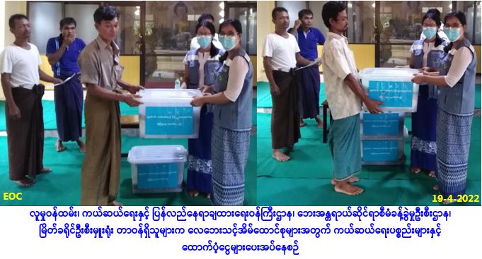 လူမှုဝန်ထမ်း၊ ကယ်ဆယ်ရေးနှင့် ပြန်လည်နေရာချထားရေးဝန်ကြီးဌာန၊ ဘေးအန္တရာယ်ဆိုင်ရာစီမံခန့်ခွဲမှု ဦးစီးဌာန၊ မြိတ်ခရိုင်ဦးစီးမှူးရုံးမှ တာဝန်ရှိသူများသည် မဇောကျးရွာအုပ်စု၊ ပြင်ကြီးကျေးရွာ၌ (၁၈-၄-၂၀၂၂) ရက်နေ့တွင် မိုးသည်းထန်စွာရွာသွန်းပြီး လေပြင်းတိုက်ခတ်မှုကြောင့် လုံးဝပြိုကျပျက်စီး နေအိမ် (၁၁) လုံးအတွက် အိမ်ဆောက်ပစ္စည်းဖိုးထောက်ပံ့ငွေ (၆၀၀,၀၀၀)ကျပ်၊ တစ်စိတ်တစ်ပိုင်းပျက်စီးနေအိမ် (၅) လုံးအတွက် အိမ်ဆောက်ပစ္စည်းဖိုးထောက်ပံ့ငွေ (၁၆၀,၀၀၀/-)ကျပ်၊ တစ်စိတ်တစ်ပိုင်းပျက်စီး ဘုန်းတော်ကြီးကျောင်း (၁)ကျောင်းအတွက် ကျောင်းဆောက်ပစ္စည်းဖိုး (၉၀,၀၀၀)ကျပ်နှင့် ဘေးသင့် အိမ်ထောင်စု(၁၁)စုမှ လူဦးရေ(၅၁)ဦးအတွက် (၇) ရက်စာဆန်ရိက္ခာဖိုးငွေ (၁၀၇,၁၀၀/-)ကျပ်၊ စုစုပေါင်း ထောက်ပံ့ငွေ (၉၅၇,၁၀၀/-)ကျပ်နှင့် ကယ်ဆယ်ရေးပစ္စည်း(၁၇)မျိုးပါ (၆) ပုံးတို့အား (၁၉-၄-၂၀၂၂) ရက် နေ့ (၁၆းဝဝ)နာရီအချိန်တွင် သွားရောက်ထောက်ပံ့ပေးအပ်ခဲ့ကြောင်း သတင်းရရှိပါသည်။