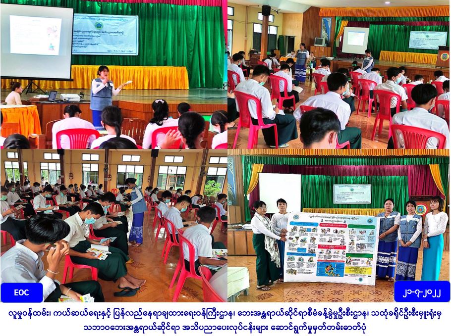 လူမှုဝန်ထမ်း၊ ကယ်ဆယ်ရေးနှင့်ပြန်လည်နေရာချထားရေးဝန်ကြီးဌာန၊ ဘေးအန္တရာယ်ဆိုင်ရာစီမံခန့်ခွဲမှုဦးစီးဌာန၊ သထုံခရိုင် ဦးစီးမှူးရုံးမှ တာဝန်ရှိသူများသည် ခရိုင်လူမှုဝန်ထမ်းဦးစီးဌာနနှင့်ပူးပေါင်း၍ (၂၁-၇-၂၀၂၂) ရက်နေ့၊ (၀၉း၀၀)နာရီအချိန်မှ (၁၁း၀၀)နာရီအချိန် ထိမွန်ပြည်နယ် သထုံခရိုင်၊ သထုံမြို့နယ် အ.ထ.က (ကျိုက်က္ကော်)ရှိ ကျောင်းသား/သူ အင်အား (၁၀၀) ဦးခန့်အား သဘာဝဘေးအန္တရာယ်ဆိုင်ရာအသိပညာပေးနှင့်ပတ်သက်၍ သိရှိလိုက်နာဆောင်ရွက်ရမည့် ဆောင်ရန်/ ရှောင်ရန် အချက်များအား ဟောပြောဆွေးနွေးပြီး လက်ကမ်းစာစောင်ဖြန့်ဝေခြင်းနှင့်ဗီနိုင်းပိုစတာ ပေးအပ်ခြင်းများဆောင်ရွက်ခဲ့ပါသည်။