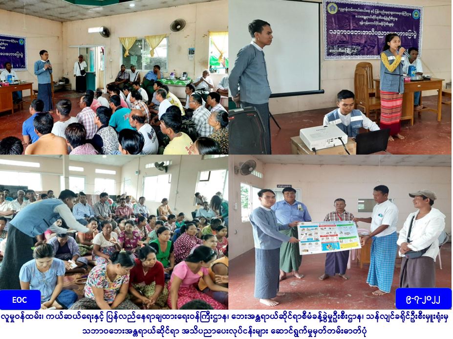 လူမှုဝန်ထမ်း၊ ကယ်ဆယ်ရေးနှင့်ပြန်လည်နေရာချထားရေးဝန်ကြီးဌာန၊ ဘေးအန္တရာယ်ဆိုင်ရာစီမံခန့်ခွဲမှုဦးစီးဌာန၊ သန်လျင်ခရိုင်ဦးစီးမှူးရုံးမှ တာဝန်ရှိသူများသည် သန်လျင်ခရိုင်၊ ကျောက်တန်းမြို့နယ်၊ ချောင်းဝကျေးရွာအုပ်စု၊ ချောင်း၀ကျေးရွာ၊ ကျေးရွာအုပ်ချုပ် ရေးမှူးရုံးတွင် ကျေးရွာသူ/ရွာသား ဦးရေ (၁၂၀) ကျော်အား ဦးစီးဌာန၏လုပ်ငန်းတာဝန်များ၊ ဆောင်ရွက်ချက်များနှင့် သဘာဝဘေးအန္တရာယ်ဆိုင်ရာ အကြောင်း သိကောင်းစရာများနှင့်ပတ်သက်၍ ဆွေးနွေးဟောပြောခြင်း၊ လက်ကမ်းစာစောင်များ ဖြန့်ဝေခြင်းနှင့် ပိုစတာများအား ကျေးရွာ အုပ်ချုပ်ရေးမှူးထံသို့ပေးအပ်ခြင်းများကို (၉-၇-၂၀၂၂) ရက်နေ့ နံနက် (၁၀:၀၀) အချိန်မှ (၁၂:၀၀) အချိန်အတွင်း ဆောင်ရွက်ခဲ့ပါသည်။