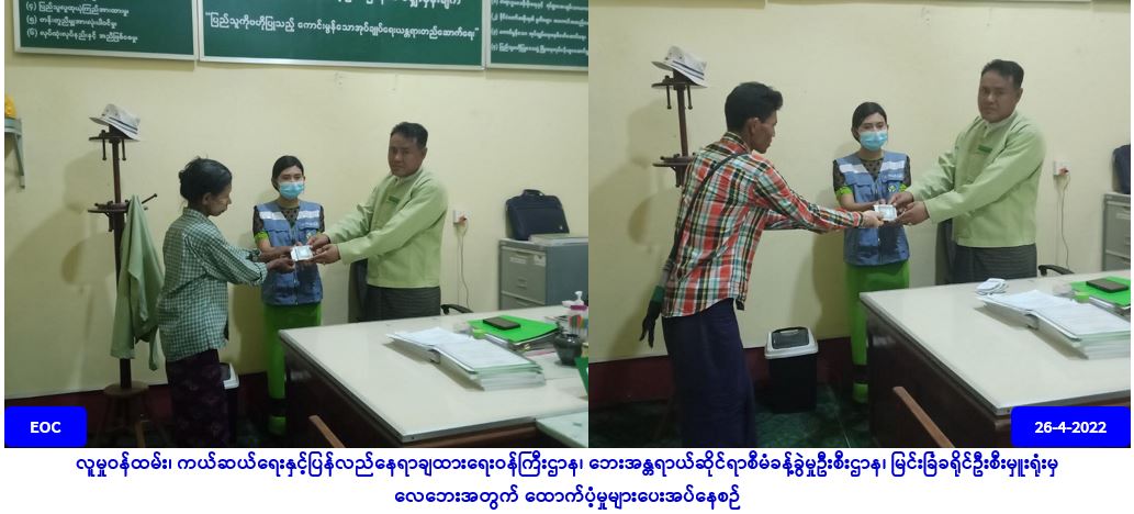 လူမှုဝန်ထမ်း၊ ကယ်ဆယ်ရေးနှင့်ပြန်လည်နေရာချထားရေးဝန်ကြီးဌာန၊ ဘေးအန္တရာယ်ဆိုင်ရာစီမံခန့်ခွဲမှု ဦးစီးဌာန၊ မြင်းခြံခရိုင် ဦးစီးမှူးရုံးမှ တာဝန်ရှိသူများသည် မြင်းခြံခရိုင်၊ မြင်းခြံမြို့နယ်၊ အမှတ်(၂)ရပ်ကွက်၊ နယ်မြေ(၃)၌ (၂၀-၄-၂၀၂၂)ရက်နေ့တွင် ဖြစ်ပွားခဲ့သော လေပြင်းတိုက်ခတ်မှုကြောင့် အမိုးလန်နေအိမ်(၂)လုံး၊ အိမ်ထောင်စု(၂)စုမှ စုစုပေါင်းလူဦးရေ(၈)ဦးဘေးသင့်ခဲ့ရာ အဆိုပါဘေးသင့်ပြည်သူများအတွက် အိမ်ဆောက် ပစ္စည်းဖိုးထောက်ပံ့ငွေ (၉၅၀၀ဝ/-)ကျပ်၊ ဆန်ရိက္ခာ (၇)ရက်စာဖိုးထောက်ပံ့ငွေ (၁၆၈၀ဝ/-)ကျပ်၊ စုစုပေါင်း ထောက်ပံ့ငွေ (၁၁၁၈၀ဝ/-) ကျပ်တို့အား (၂၆-၄-၂၀၂၂) ရက်နေ့၊ နံနက်(၁၀:၀၀)နာရီအချိန်တွင် မြင်းခြံ မြို့နယ်အထွေထွေအုပ်ချုပ်ရေးဦးစီးဌာန၌ ဘေးသင့်ပြည်သူများလက်ဝယ်အရောက် ထောက်ပံ့ပေးအပ် ခဲ့ပါသည်။