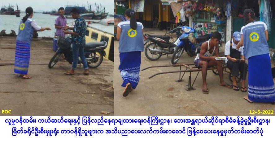 လူမှုဝန်ထမ်း၊ ကယ်ဆယ်ရေးနှင့် ပြန်လည်နေရာချထားရေးဝန်ကြီးဌာန၊ ဘေးအန္တရာယ်ဆိုင်ရာစီမံ ခန့်ခွဲမှုဦးစီးဌာန၊မြိတ်ခရိုင်ဦးစီးမှူးရုံးမှ တာဝန်ရှိသူများသည် (၁၂-၅-၂၀၂၂) ရက်နေ့တွင် မြိတ်မြို့နယ်၊ မြို့သစ်ရပ်ကွက်၊ ယောကြီးဝတံတားရှိ ခရီးသွားရေယာဉ်များနှင့် ပြည်သူများအား မိုးဦးကာလတွင် ဖြစ်ပွား သည့် သဘာဝဘေးအန္တရာယ်များနှင့်ပတ်သက်၍ ကြိုတင်သတိပြုနိုင်ရန်၊ ကြိုတင်ပြင်ဆင်ကာကွယ်မှုများပြုလုပ်နိုင်ရန်အတွက် သဘာဝဘေးအသိပညာပေး လက်ကမ်းစာစောင် ဖြန့်ဝေပေးခြင်းများ ဆောင်ရွက်ခဲ့ပါကြောင်း သတင်းရရှိပါသည်။