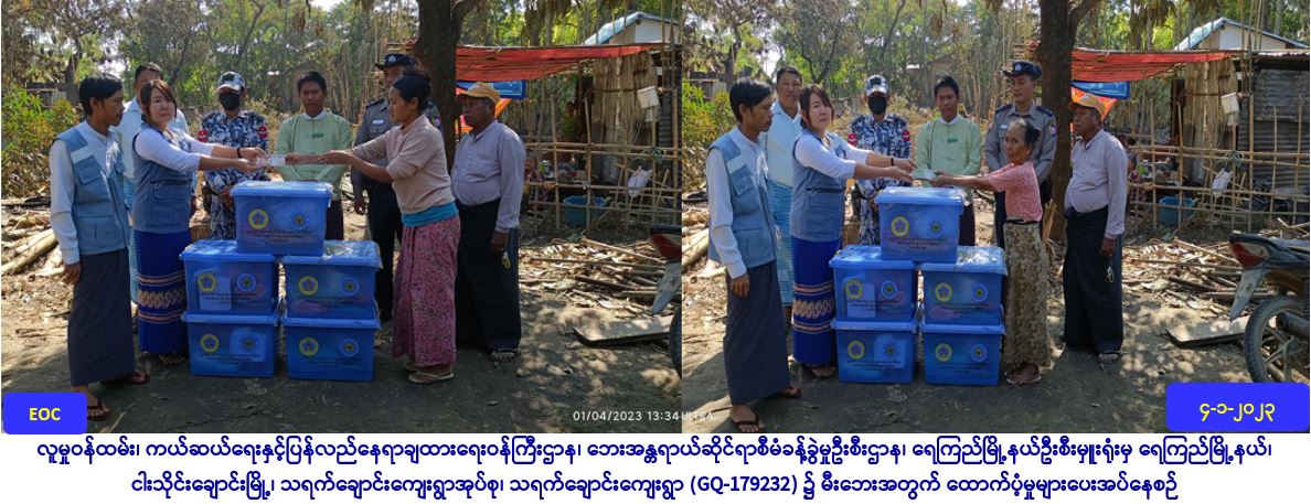 လူမှုဝန်ထမ်း၊ ကယ်ဆယ်ရေးနှင့်ပြန်လည်နေရာချထားရေးဝန်ကြီးဌာန၊ ဘေးအန္တရာယ်ဆိုင်ရာစီမံခန့်ခွဲမှုဦးစီးဌာန၊ ရေကြည်မြို့နယ်ဦးစီးမှူးရုံးမှ တာဝန်ရှိ သူများသည် ရေကြည်မြို့နယ်၊ ငါးသိုင်းချောင်းမြို့၊ သရက်ချောင်းကျေးရွာအုပ်စု၊ သရက်ချောင်းကျေးရွာ (GQ-179232)၌ (၃-၁-၂၀၂၃)ရက်နေ့ (၀၉း၃၀) နာရီအချိန်တွင် မီးလောင်ကျွမ်းမှုကြောင့် ပျက်စီးဆုံးရှုံးခဲ့ရသည့် နေအိမ် (၅)လုံးအတွက် အိမ်ဆောက်ပစ္စည်းဖိုးရန်ပုံငွေ (၇၀၀၀၀၀/-)ကျပ်၊ အိမ်ထောင်စု(၅)စုမှ စုစုပေါင်းလူဦးရေ(၁၈)ဦးအတွက် ဆန်ရိက္ခာ (၇)ရက်စာ ရန်ပုံငွေ(၃၇၈၀၀/-)ကျပ်၊ စုစုပေါင်းကယ်ဆယ်ရေးရန်ပုံငွေ (၇၃၇၈၀၀/-)ကျပ်နှင့် ကယ်ဆယ်ရေးပစ္စည်း (၁၈)မျိုးပါ (၅)အိမ်ထောင်စာ(၂၄၅၁၈၀/-)ကျပ်အား (၄-၁-၂၀၂၃)ရက်နေ့ (၁၄း၀၀)နာရီအချိန်တွင် တာဝန်ရှိသူများရှေ့မှောက်၌ ဘေးသင့်ပြည်သူများ လက်ဝယ် အရောက် ထောက်ပံ့ပေးအပ်ခဲ့ပါသည်။