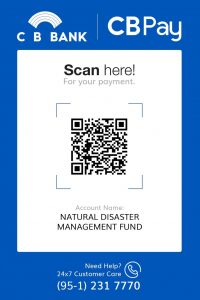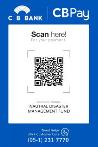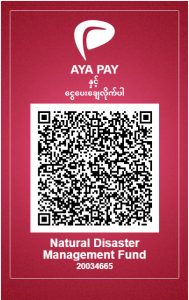 ၄။ ဘဏ်များမှလှူဒါန်းလိုပါက မြန်မာကျပ်ငွေကို မြန်မာ့စီးပွားရေးဘဏ်၊ နေပြည်တော်တွင် ငွေစာရင်းအမှတ် OA-011834 ကို ဖွင့်လှစ်ထားပြီး အောက်ပါနည်းလမ်းများဖြင့် လှူဒါန်းနိုင်ပါသည်-