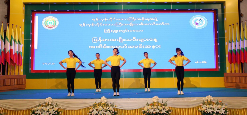 အခမ်းအနားတွင် ရန်ကုန်တိုင်းဒေသကြီး ဝန်ကြီးချုပ်ဦးစိုးသိန်းမှ အဖွင့်အမှာစကားပြောကြားပြီး၊ မြန်မာအမျိုးသမီးများနေ့အထိမ်းအမှတ် လှုပ်ရှားဆောင်ရွက်မှု Video Clip ပြသခြင်း၊ ရန်ကုန်တိုင်းဒေသကြီး အမျိုးသမီးကော်မတီ၏ လုပ်ငန်းဆောင်ရွက်မှု Video Clip ပြသခြင်း၊ အ.ထ.က (၂) ဗဟန်းမှ ကျောင်းသူလေးများက လည်းကောင်း၊ အ.ထ.က (၁) ဒဂုံမှ ကျောင်းသူလေးများက လည်းကောင်း၊ မြန်မာနိုင်ငံအမျိုးသမီးအားကစားအဖွဲ့ချုပ်မှ Fitness Dance ဖြင့် လည်းကောင်း၊ အမျိုးသားယဉ်ကျေးမှုနှင့် အနုပညာတက္ကသိုလ်မှ ကျောင်းသူလေးများမှ လည်းကောင်း ဖျော်ဖြေတင်ဆက်ကပြခဲ့ကြပါသည်။