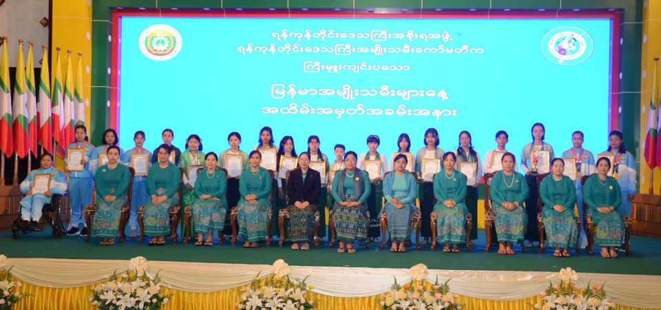 ထို့နောက် မြန်မာအမျိုးသမီးများနေ့ အထိမ်းအမှတ်အဖြစ် အခြေခံပညာ မူလတန်း၊ အလယ်တန်း၊ အထက်တန်းအဆင့် စာစီစာကုံးပြိုင်ပွဲတွင် ပထမ၊ ဒုတိယ၊ တတိယဆုရရှိခဲ့သော ကျောင်းသား/ ကျောင်းသူများအား လည်းကောင်း၊ (၃၂) ကြိမ်မြောက် အရှေ့တောင်အာရှ အားကစားပြိုင်ပွဲနှင့် (၁၂) ကြိမ်မြောက်အရှေ့တောင်အာရှမသန်စွမ်းအားကစားပြိုင်ပွဲတွင် ရန်ကုန်တိုင်းဒေသကြီးမှ နိုင်ငံဂုဏ်ဆောင်ဆု တံဆိပ်များရရှိခဲ့ကြသော အမျိုးသမီး (၈) ဦးအား လည်းကောင်း၊ ၂၀၂၂-၂၀၂၃ ပညာသင်နှစ် တက္ကသိုလ်ဝင်တန်းစာမေးပွဲတွင် တစ်နိုင်ငံလုံးအဆင့် ထူးချွန်စွာ အောင်မြင်ခဲ့သည့် ကျောင်းသူ (၄) ဦးအား လည်းကောင်း၊ ဖျော်ဖြေရေးအစီအစဉ်တွင်ပါဝင်သည့် အဖွဲ့များအားလည်းကောင်း ရန်ကုန်တိုင်းဒေသကြီးအစိုးရအဖွဲ့ ဝန်ကြီးချုပ်နှင့်ဇနီး၊ ရန်ကုန်တိုင်း စစ်ဌာနချုပ် တိုင်းမှူးနှင့်ဇနီး၊ တက်ရောက်လာကြတဲ့ ဝန်ကြီးများနှင့်ဇနီးများ၊ တာဝန်ရှိသူတို့မှ ဂုဏ်ပြုမှတ်တမ်းလွှာနှင့် ဂုဏ်ပြုဆုများ အသီးသီးချီးမြှင့်ခဲ့ပါသည်။