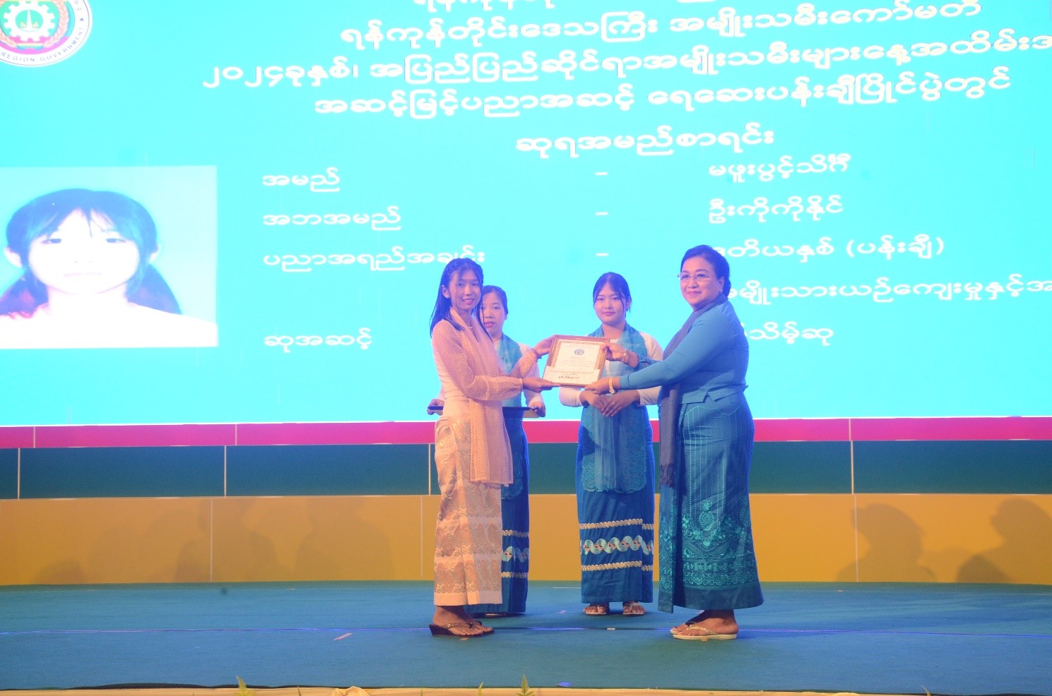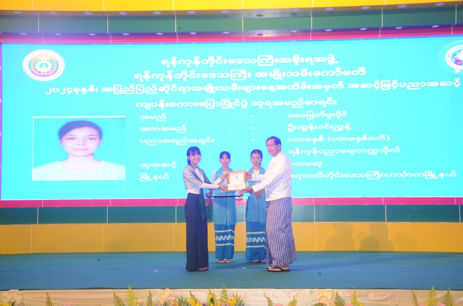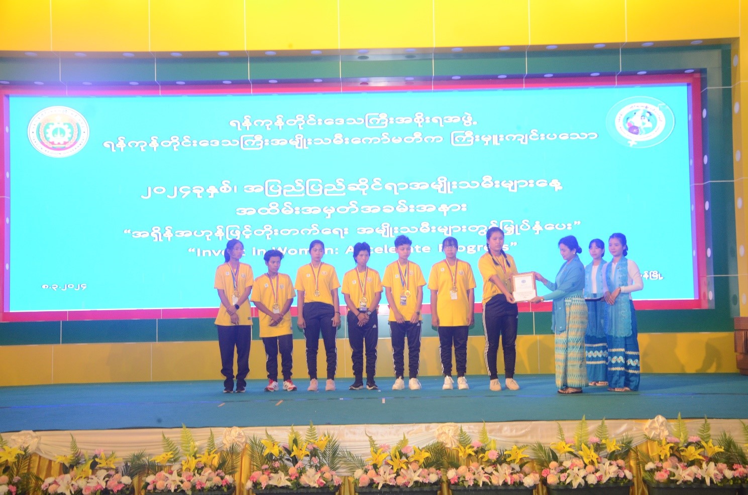 ထို့နောက် အပြည်ပြည်ဆိုင်ရာအမျိုးသမီးများနေ့အကြို အဆင့်မြင့်ပညာအဆင့်ကျပန်းစကားပြောပြိုင်ပွဲ၊ ရေဆေးပန်းချီပြိုင်ပွဲနှင့် စာစီစာကုံးပြိုင်ပွဲများတွင် ယခုဆောင်ပုဒ်ဖြစ်သည့် “အရှိန်အဟုန်ဖြင့်တိုးတက်ရေး အမျိုးသမီးများတွင်မြှုပ်နှံပေး” “Invest in Women: Accelerate Progress” ခေါင်းစဉ်ဖြင့် ပြိုင်ပွဲဝင်ခဲ့ပြီး ပထမ၊ ဒုတိယ၊ တတိယနှင့် နှစ်သိမ့်ဆုများ ရရှိခဲ့သော ကျောင်းသူများအားလည်းကောင်း၊ တိုင်းဒေသကြီး/ ပြည်နယ်အဆင့် အားကစားပြိုင်ပွဲများတွင် ရွှေတံဆိပ်ဆုရရှိခဲ့သူ ထူးချွန်အမျိုးသမီးများအားလည်းကောင်း၊ ဖျော်ဖြေရေး အစီအစဉ်တွင် ပါဝင်သည့် အဖွဲ့များအားလည်းကောင်း ရန်ကုန်တိုင်းဒေသကြီးအစိုးရအဖွဲ့ ဝန်ကြီးချုပ်နှင့်ဇနီး၊ ရန်ကုန်တိုင်းစစ်ဌာနချုပ် တိုင်းမှူးနှင့်ဇနီး၊ တက်ရောက်လာကြတဲ့ ဝန်ကြီးများနှင့်ဇနီးများ၊ တာဝန်ရှိသူတို့မှ ဂုဏ်ပြုမှတ်တမ်းလွှာနှင့် ဂုဏ်ပြုဆုများ အသီးသီး ချီးမြှင့်ခဲ့ပါသည်။