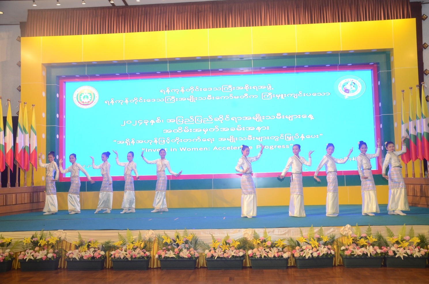 အခမ်းအနားတွင် ရန်ကုန်တိုင်းဒေသကြီး ဝန်ကြီးချုပ်ဦးစိုးသိန်းမှ အဖွင့်အမှာစကားပြောကြားပြီး၊ ကမ္ဘာ့ကုလသမဂ္ဂအထွေထွေအတွင်းရေးမှူးချုပ်၏ သဝဏ်လွှာအား Video Clip ပြသခြင်း၊ မြန်မာနိုင်ငံလုံးဆိုင်ရာအမျိုးသမီးကော်မတီ၏ လှုပ်ရှားဆောင်ရွက်မှု Video Clip နှင့် ရန်ကုန်တိုင်းဒေသကြီး အမျိုးသမီးကော်မတီ၏ လှုပ်ရှားဆောင်ရွက်မှု Video Clip ပြသခြင်း၊ ထို့နောက် အမျိုးသားယဉ်ကျေးမှုနှင့် အနုပညာတက္ကသိုလ်မှ ကျောင်းသူလေးများမှလည်းကောင်း၊ သူနာပြုတက္ကုသိုလ်မှ ကျောင်းသူလေးများကလည်းကောင်း၊ ရန်ကုန်တိုင်းဒေသကြီး အမျိုးသမီးအားကစားအဖွဲ့ ဆပ်ကော်မတီမှ သမီးငယ်လေးများကလည်းကောင်း၊ မြန်မာ့သိုင်းအဖွဲ့ချုပ်မှ သမီးပျိုလေးများကလည်းကောင်း၊ အမှတ်(၁)မူလတန်းကြိုကျောင်းမှ ရင်သွေးငယ်များကလည်းကောင်း ဖျော်ဖြေတင်ဆက်ကပြခဲ့ကြပါသည်။