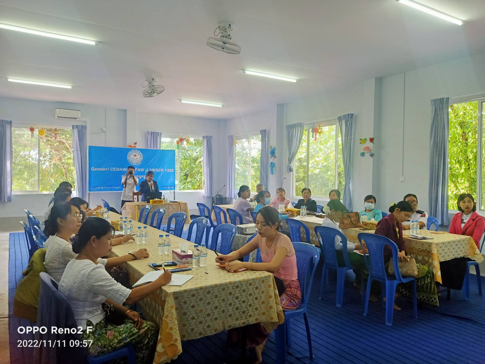 မွန်ပြည်နယ်လူမှုဝန်ထမ်းရုံးမှကြီးမှူးပြီး (၁၁.၁၁.၂၀၂၂) ရက်နေ့၊ နံနက်(၁၀:၀၀)နာရီအချိန်တွင် မော်လမြိုင်မြို့၊ လူမှုဝန်ထမ်ဦးစီးဌာန၊ ပြည်နယ်လူမှုဝန်ထမ်းရုံးခန်းမ၌ မော်လမြိုင်ခရိုင်အမျိုးသမီးကော်မတီဝင်များနှင့် မွန်ပြည်နယ်လူမှုဝန်ထမ်းရုံးကြီးကြပ်မှုအောက်ရှိ ဌာနငယ်/သင်တန်းကျောင်းများမှ ကျောင်းအုပ်များအား Gender/ CEDAW/ NSPAW နှင့် UNSCR 1325 အသိပညာပေးဆွေးနွေးပွဲကို ကျင်းပပြုလုပ်ခဲ့ရာ မွန်ပြည်နယ်လူမှုဝန်ထမ်းရုံး၊ ဒုတိယညွှန်ကြားရေးမှူး ဒေါ်စုမြတ်နွယ်က Gender/ CEDAW/ NSPAW နှင့် UNSCR 1325 ဆိုင်ရာအကြောင်းအရာများကို ရှင်းလင်းဆွေးနွေးခဲ့ပါကြောင်းနှင့် အသိပညာပေးဆွေးနွေးပွဲကို နေ့လည်(၁၁:၃၀)နာရီ အချိန်တွင် ရုပ်သိမ်းခဲ့ပါသည်။