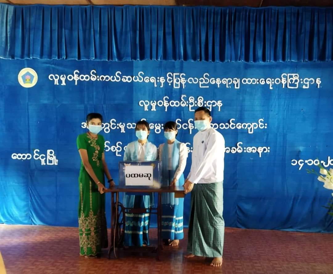 တောင်ငူမြို့အိမ်တွင်းမှုသက်မွေးလုပ်ငန်းပညာသင်ကျောင်း အပတ်စဉ် (၄/၂၀၂၂) သင်တန်းဆင်းပွဲ အခမ်းအနားတွင် ပဲခူးတိုင်းဒေသကြီးအစိုးရအဖွဲ့ဝင် တိုင်းရင်းသားရေးရာဝန်ကြီးမှ အဖွင့်အမှာစကားပြောကြားပြီး သင်တန်းဆင်းအောင်လက်မှတ်နှင့် ထူးချွန်ဆုရရှိသော သင်တန်းသူတစ်ဦးအား အပ်ချုပ်စက်တစ်လုံးဆုချီးမြှင့်ခဲ့ပါသည်။