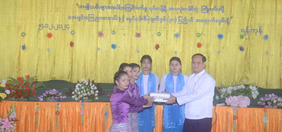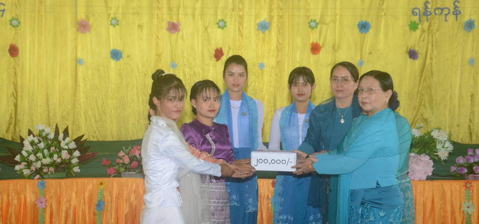 ဆက်လက်ပြီး ဖျော်ဖြေတင်ဆက်ခဲ့ကြသည့် အဖွဲ့များအား လူမှုဝန်ထမ်းဦးစီးဌာနမှ ငွေကျပ် ၃၀၀,၀၀၀/-၊ ရန်ကုန်တိုင်းဒေသကြီး အမျိုးသမီးရေးရာအဖွဲ့မှ ငွေကျပ် ၂၀၀,၀၀၀/-၊ ရန်ကုန်တိုင်းဒေသကြီး မိခင်နှင့်ကလေးစောင့်ရှောက်မှုကြီးကြပ်ရေးအဖွဲ့မှ ငွေကျပ် ၂၀၀၀၀၀/-၊ ရန်ကုန်တိုင်းဒေသကြီး အမျိုးသမီးအားကစားဆပ်ကော်မတီမှ ငွေကျပ် ၁၀,၀၀,၀၀၀/-၊ လေးကျွန်းသူဖောင်ဒေးရှင်းမှ ငွေကျပ် ၁၀၀၀,၀၀၀/- နှင့် AFXB အဖွဲ့တို့မှ ငွေကျပ် ၃၀၀,၀၀၀/- နှင့် T-shirt အထည် (၇၀)အား လှူဒါန်းပေးခဲ့ပြီး ရန်ကုန်တိုင်းဒေသကြီးအစိုးရအဖွဲ့၊ တိုင်းရင်းသားရေးရာဝန်ကြီး၊ ရန်ကုန်တိုင်းဒေသကြီး အမျိုးသမီးကော်မတီနာယက/ ရန်ကုန်တိုင်းဒေသကြီးအစိုးရအဖွဲ့၊ ဝန်ကြီးချုပ်၏ဇနီးနှင့် တာဝန်ရှိသူများမှ အသီးသီးချီးမြှင့်ခဲ့ကြပြီး အခမ်းအနားကို နံနက် (၁၁:၀၀)နာရီတွင် အောင်မြင်စွာ ကျင်းပပြီးစီးခဲ့ပါသည်။
