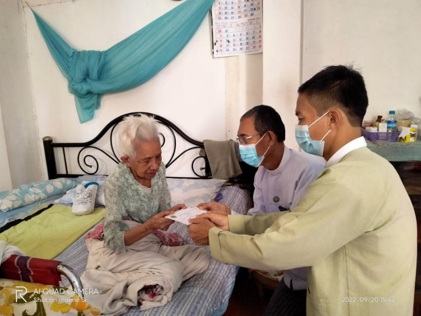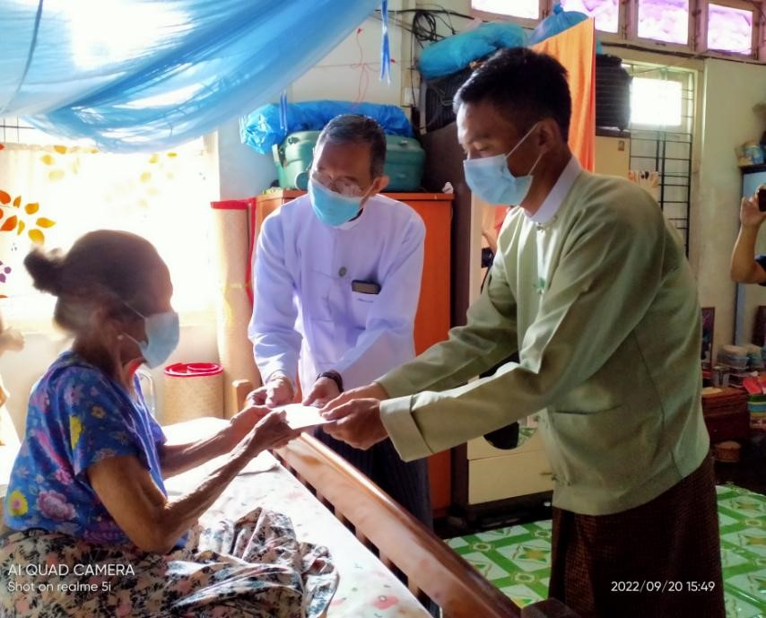 လူမှုဝန်ထမ်း၊ ကယ်ဆယ်ရေးနှင့်ပြန်လည်နေရာချထားရေးဝန်ကြီးဌာနသည် အသက် (၈၅) နှစ်နှင့်အထက် သက်ကြီးရွယ်အိုများအား လူမှုရေးပင်စင်ထောက်ပံ့ငွေများပေးလျက်ရှိရာ ၂၀၂၂-၂၀၂၃ ဘဏ္ဍာရေးနှစ်၊ ဒုတိယသုံးလပတ်အတွက် ရန်ကုန်တိုင်းဒေသကြီး အင်းစိန်မြို့နယ်အတွင်းရှိ လူမှုရေးပင်စင်ခံစားသည့် အကျုံးဝင်သူများအား (၂၁.၉.၂၀၂၂) ရက်နေ့တွင် ရန်ကုန်တိုင်းဒေသကြီး လူမှုဝန်ထမ်းရုံးမှ ညွှန်ကြားရေးမှူးနှင့်တာဝန်ရှိသူများ၊ အင်းစိန်ခရိုင်အထွေထွေအုပ်ချုပ်ရေးဦးစီးဌာနမှတာဝန်ရှိသူတို့မှ အိမ်တိုင်ရာရောက်သွားရောက် ထောက်ပံ့ပေးအပ်ခဲ့ကြပါသည်။