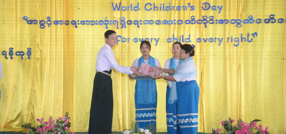 ထို့နောက် ဖျော်ဖြေရေးတွင်ပါဝင်ခဲ့ကြသည့် ကလေးများအား ရန်ကုန်တိုင်းဒေသကြီး ကလေးသူငယ်အခွင့်အရေးများဆိုင်ရာကော်မတီ၊ ရန်ကုန်တိုင်းဒေသကြီး အမျိုးသမီးရေးရာအဖွဲ့၊ ရန်ကုန်တိုင်းဒေသကြီး မိခင်နှင့်ကလေးစောင့်ရှောက်မှုကြီးကြပ်ရေးအဖွဲ့နှင့် Tdh-L အဖွဲ့တို့မှ ဂုဏ်ပြုဆုများချီးမြှင့်ခဲ့ကြပြီး နံနက် (၁၁:၀၀) နာရီတွင် အခမ်းအနားအောင်မြင်စွာ ပြီးမြောက်ခဲ့ပါသည်။