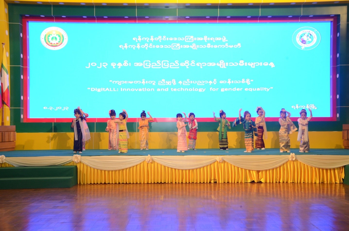 အခမ်းအနားတွင် ရန်ကုန်တိုင်းဒေသကြီးဝန်ကြီးချုပ်ဦးစိုးသိန်းမှ အဖွင့်အမှာစကားပြော ကြားပြီး၊ ကုလသမဂ္ဂ အထွေထွေ အတွင်းရေးမှူးချုပ်ထံမှ ပေးပို့သည့် သဝဏ်လွှာအား Video Clip ပြသခြင်း၊ ရန်ကုန်တိုင်းဒေသကြီး အမျိုးသမီးကော်မတီ၏ လုပ်ငန်းဆောင်ရွက်မှု Video Clip ပြသခြင်း၊ အမှတ် (၁) မူလတန်းကြိုကျောင်းမှ ရင်သွေးငယ်လေးများမှ တင်ဆက်ကပြခြင်း၊ အမျိုသမီးကလေးများသင်တန်းကျောင်း(ရန်ကုန်)မှ သမီးပျိုလေးများ၏အကနှင့် မြန်မာ့သိုင်း သရုပ်ပြတင်ဆက်ခြင်း၊ မြန်မာနိုင်ငံအမျိုးသမီးအားကစားအဖွဲ့ချုပ်မှ Fitness Dance များဖြင့် တင်ဆက်ကပြခဲ့ကြပါသည်။