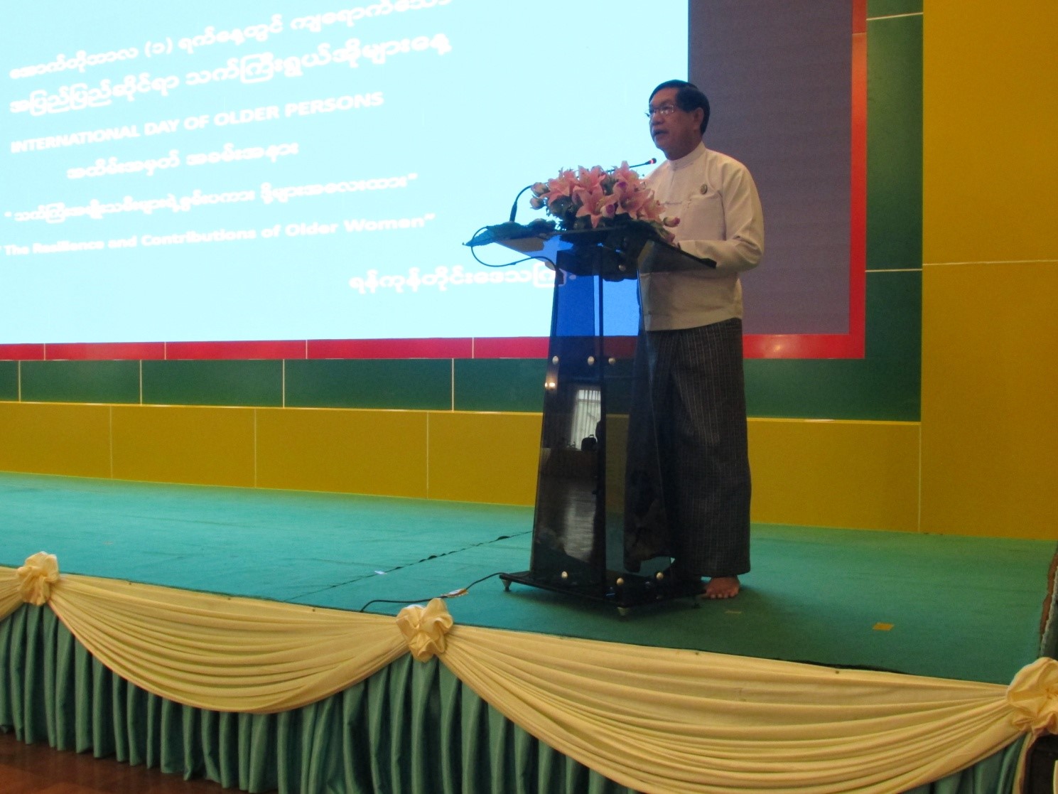 ၂၀၂၂ခုနှစ်၊ အောက်တိုဘာလ (၁) ရက်နေ့တွင် ကျရောက်သည့် အပြည်ပြည်ဆိုင်ရာသက်ကြီး ရွယ်အိုများနေ့ အထိမ်းအမှတ်အခမ်းအနားအား ရန်ကုန်တိုင်းဒေသကြီးအစိုးရအဖွဲ့၏ ဦးဆောင်မှုဖြင့် (၃၀.၉.၂၀၂၂) ရက်နေ့၊ နံနက်(၁၀:၀၀)နာရီတွင် ရန်ကုန်တိုင်းဒေသကြီးအစိုးရအဖွဲ့ရုံး၊ မင်္ဂလာခန်းမ၌ ကျင်းပပြုလုပ်ခဲ့ရာ အဆိုပါအခမ်းအနားသို့ ရန်ကုန်တိုင်းဒေသကြီးအစိုးရအဖွဲ့၊ ဝန်ကြီးချုပ် ဦးစိုးသိန်းနှင့်ဇနီး၊ ရန်ကုန်တိုင်းဒေသကြီးအစိုးရအဖွဲ့ဝင် ဝန်ကြီးများ၊ ရန်ကုန်တိုင်းဒေသကြီး ဥပဒေချုပ်၊ ရန်ကုန်တိုင်းဒေသကြီးအစိုးရအဖွဲ့ အတွင်းရေးမှူးနှင့် ဌာနဆိုင်ရာများမှ တာဝန်ရှိသူများ၊ တိုင်းဒေသကြီးအမျိုးသမီးကော်မတီ၊ တိုင်းဒေသကြီးအမျိုးသမီးရေးရာအဖွဲ့၊ မိခင်နှင့်ကလေးစောင့်ရှောက်ရေးကြီးကြပ်မှုအဖွဲ့၊ အမျိုးသမီးနှင့်ကလေးဘဝမြှင့်တင်ရေးအဖွဲ့မှ ဥက္ကဌများ၊ တိုင်းဒေသကြီးကြက်ခြေနီကြီးကြပ်မှုအဖွဲ့မှ တာဝန်ရှိသူများ၊ ခရိုင်နှင့်မြို့နယ် အုပ်ချုပ်ရေးမှူးများ၊ သက်ကြီးသူချင်းကူညီစောင့်ရှောက်ရေးအဖွဲ့မှ တာဝန်ရှိသူများ၊ ဘိုးဘွားရိပ်သာများမှ ကိုယ်စားလှယ်များ၊ ကန်ကော့ခံဘိုးဘွားများနှင့်သက်ကြီးရွယ်အိုများ နေ့ပိုင်းစောင့်ရှောက်ရေးဂေဟာမှ ဘိုးဘွားများစုစုပေါင်း (၂၄၅)ဦးတက်ရောက်ခဲ့ပါသည်။