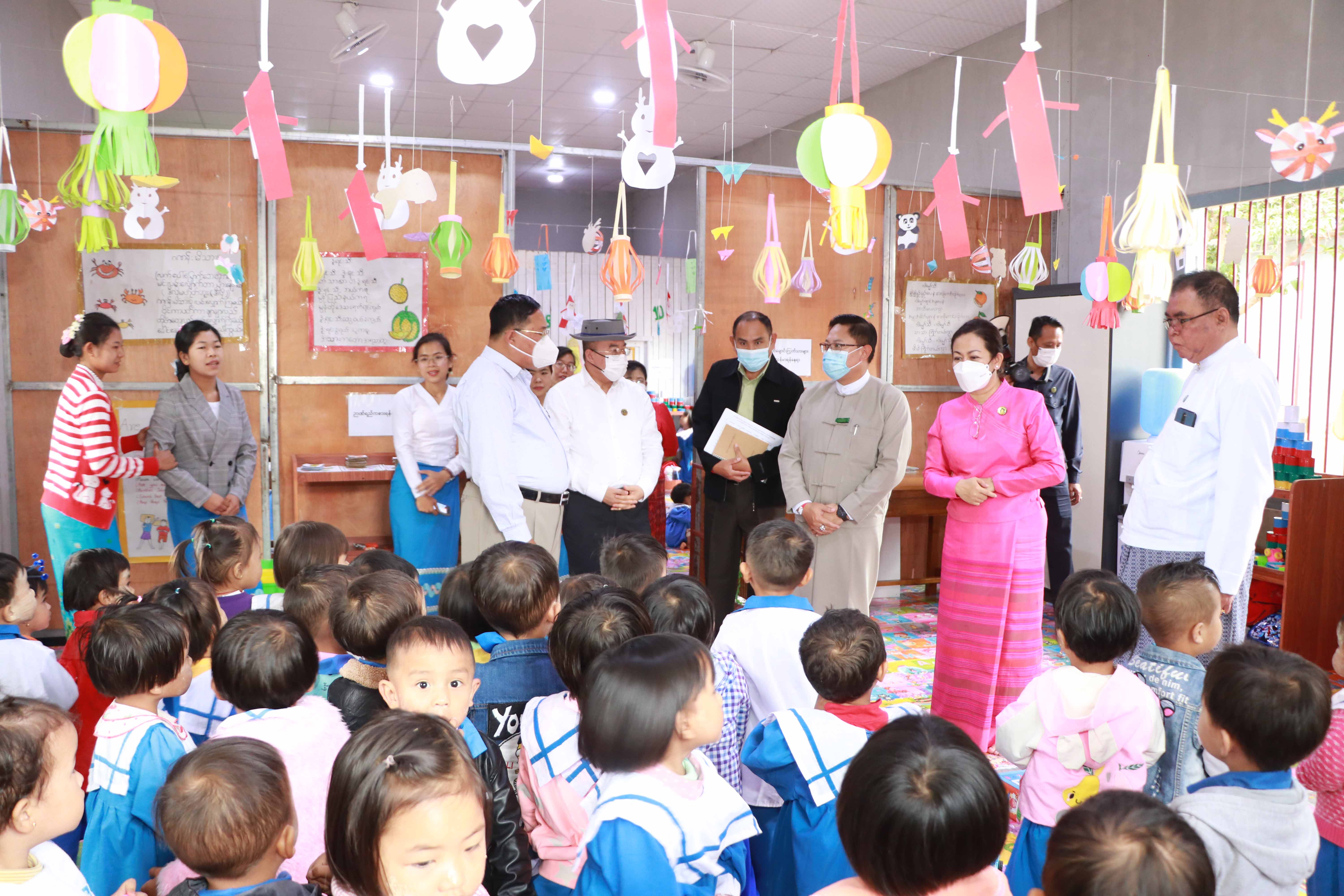 ဆက်လက်၍ လူမှုဝန်ထမ်း၊ကယ်ဆယ်ရေးနှင့် ပြန်လည်နေရာချထားရေးဝန်ကြီးဌာန၊ ပြည်ထောင်စုဝန်ကြီး ဒေါက်တာသက်သက်ခိုင်၊ရှမ်းပြည်နယ်ဝန်ကြီးချုပ်၊ ဒေါက်တာကျော်ထွန်းတို့သည်ဒေသစီမံအုပ်ချုပ်ရေးအဖွဲ့ဥက္ကဋ္ဌ၊ ဦးအာကာလင်းနှင့်အတူ တာဝန်ရှိသူများလိုက်ပါလျက်လူမှုဝန်ထမ်းဦးစီးဌာနမှဖွင့်လှစ်ထားသောပင်းတယမြို့၊ မူလတန်းကြိုကျောင်းသို့ရောက်ရှိကြရာ ပြည်နယ်လူမှုဝန်ထမ်းဦးစီးမှူးနှင့်တာဝန်ခံကျောင်းအုပ်တို့ကကလေး(၁၀၀)ဦး လက်ခံသင်ကြားပေးနေမှုအခြေအနေများကိုရှင်းလင်းတင်ပြခဲ့ရာပြည်ထောင်စုဝန်ကြီးကတက်ရောက်နေသောကလေးငယ်များ၏ဉာဏစွမ်းရည်တိုးတက်စေရန် လေ့ကျင့်နေမှုအခြေအနေများကို ရင်းနှီးနွေးထွေးစွာကြည့်ရှုအားပေးခဲ့ပြီးကလေးများအတွက်ဖြည့်စွက်စာအာဟာရဖြစ်စေရန် မုန့်များကျွေးမွေးခဲ့ပြီးမူလတန်းကြိုကျောင်းအုပ်နှင့်ဆရာမများအား ကလေးများမူကြိုကျောင်းတွင် ပျော်ရွှင်စွာနေထိုင်ရေးဂရုပြုဆောင်ရွက်ကြရန်လမ်းညွှန်မှာကြားခဲ့ကြောင်းသတင်းရရှိပါသည်။