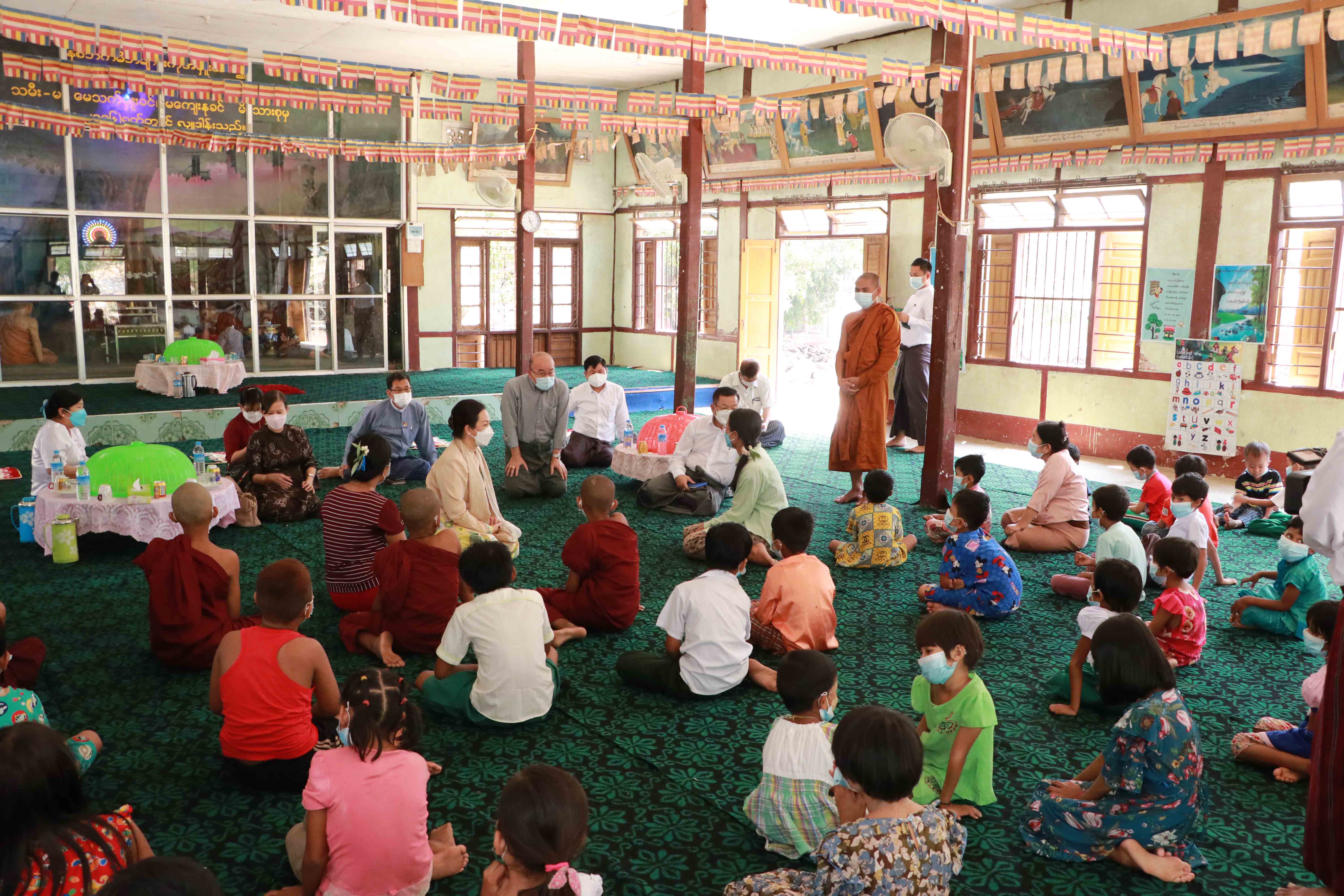ဆက်လက်၍ ပြည်ထောင်စုဝန်ကြီးနှင့်အဖွဲ့သည် ဂေဟာမှတာဝန်ရှိသူများအား ကလေး သူငယ်များ၏အကောင်းဆုံးအကျိုးစီးပွားကို ရရှိခံစားနိုင်စေရေးနှင့် ၎င်းတို့၏ အသက်အရွယ်အလိုက် ကိုယ်ခန္ဓာနှင့်ဉာဏ်ရည်ဖွံ့ဖြိုးစေရေး၊ အသိပညာနှင့် အတတ်ပညာများ သင်ကြားတက်မြောက်စေရေး အတွက် ဆောင်ရွက်ပေးစေလိုသည့်အချက်များ တိုက်တွန်းမှာ ကြားခဲ့ပြီး ကလေးသူငယ်များအား ရင်းရင်းနှီးနှီး တွေ့ဆုံနူတ်ဆက်အားပေး စကားပြောကြားကာ ကလေးသူငယ်များ လိမ္မာရေးခြားရှိပြီး နိုင်ငံနှင့်လူမျိုးအတွက် အကျိုးပြုနိုင်သော တန်ဖိုးရှိသည့် လူသားအရင်းအမြစ်များဖြစ် တိုးတက်ကြီး ပြင်းလာစေရေးနှင့် ပညာဖြင့်မိမိတို့၏ဘဝကို တည်ဆောက်နိုင်ရေးအတွက် မှန်ကန်သော အားကျအတုယူမှုနှင့် ရည်မှန်းချက်များထားရှိကာ စိတ်အားငယ်မှုများမရှိဘဲ စည်းလုံးညီညွတ်စွာဖြင့် ကြိုးစားသင်ယူစေလိုကြောင်း တိုက်တွန်းမှာကြားခဲ့ပြီး ကလေးသူငယ်များ၏စာသင်ဆောင်၊ အိပ်ဆောင်များအား လိုက်လံကြည့်ရှုကာ လိုအပ်ချက်များကို ပေါင်းစပ်ညိှနှိုင်းဆောင်ရွက်ပေးခဲ့ပါသည်။