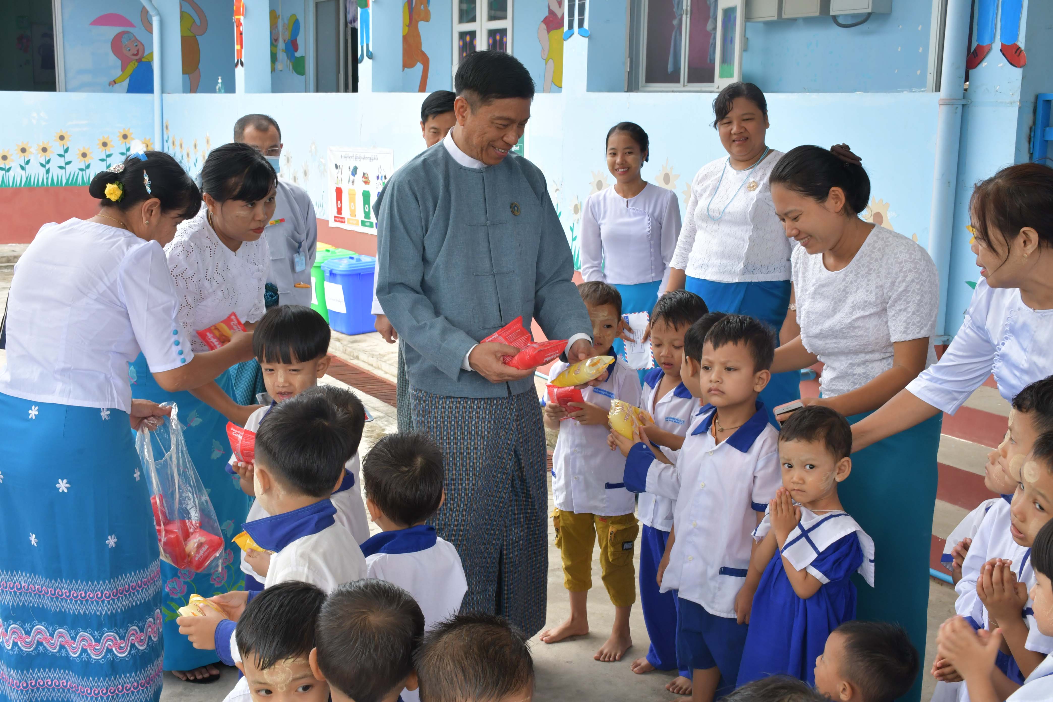 ထို့နောက်ပြည်ထောင်စုဝန်ကြီးကကလေးများနှင့်တွေ့ဆုံ၍ကလေးများ၏ဖွံ့ဖြိုးမှုအခြေအနေနှင့်သင်ကြားနေမှုအခြေအနေတို့ကိုကြည့်ရှုပြီးဂီတအပါအဝင်ကဏ္ဍစုံကိုကောင်းစွာသင်ကြားလေ့ကျင့်ပေးရန်လိုအပ်ကြောင်း၊ငယ်စဉ်ကတည်းကအသိပညာနှင့်ယဉ်ကျေးမှုအဆင့်အတန်းမြင့်မားသည့်လူသားစွမ်းအားစုများဖြစ်ပေါ်စေရေးအတွက်မူကြိုအရွယ်နှင့်သင့်လျော်သည့်ပြည်သူ့နီတိ၊ ယဉ်ကျေးလိမ္မာဆုံးမစာတို့တွင် ပါဝင်သည့် လိမ္မာရေးခြားရှိမှု၊ ကိုယ်ချင်းစာတရားရှိမှုစသည်တို့ကိုကလေးများနားလည်နိုင်မှုအခြေအနေပေါ်မူတည်၍ကဗျာ၊ပုံပြင်၊သီချင်းတို့ဖြင့်စနစ်တကျသင်ကြားပေးရမည်ဖြစ်ကြောင်း၊မူကြိုအရွယ်တွင် အခြားသူများကိုဦးစားပေးတတ်သည့်အလေ့အကျင့်၊ စည်းလုံးညီညွတ်စွာနေထိုင်တတ်သည့်အလေ့အကျင့်နှင့် မိမိကိုယ်ကိုတန်ဖိုးထားတတ်သည့်စိတ်ဓာတ်ကောင်းများရရှိစေရန် သင်ကြားလေ့ကျင့်ပေးရမည်ဖြစ်ပြီးမူလတန်းကြိုကျောင်းများသည် ကလေးများ၏သင်ယူမှုအခွင့်အလမ်းများအတွက်အခြေခံအုတ်မြစ်များဖြစ်ပါကြောင်း၊ကလေးငယ်များသည်အနာဂတ်နိုင်ငံ့ခေါင်းဆောင်များဖြစ်လာမည့်တိုင်းပြည်၏အဖိုးတန်ရတနာများဖြစ်ပါသဖြင့်သင်ယူမှုပတ်ဝန်းကျင်ကောင်းမွန်စွာဖြင့်အခြေခံအလေ့အကျင့်ကောင်းများကိုမိမိတို့ကလေးများရရှိစေရေးအတွက်ကြိုးပမ်းဆောင်ရွက်သွားကြရန်လိုအပ်ကြောင်းတိုက်တွန်းမှာကြားခဲ့ပါသည်။
