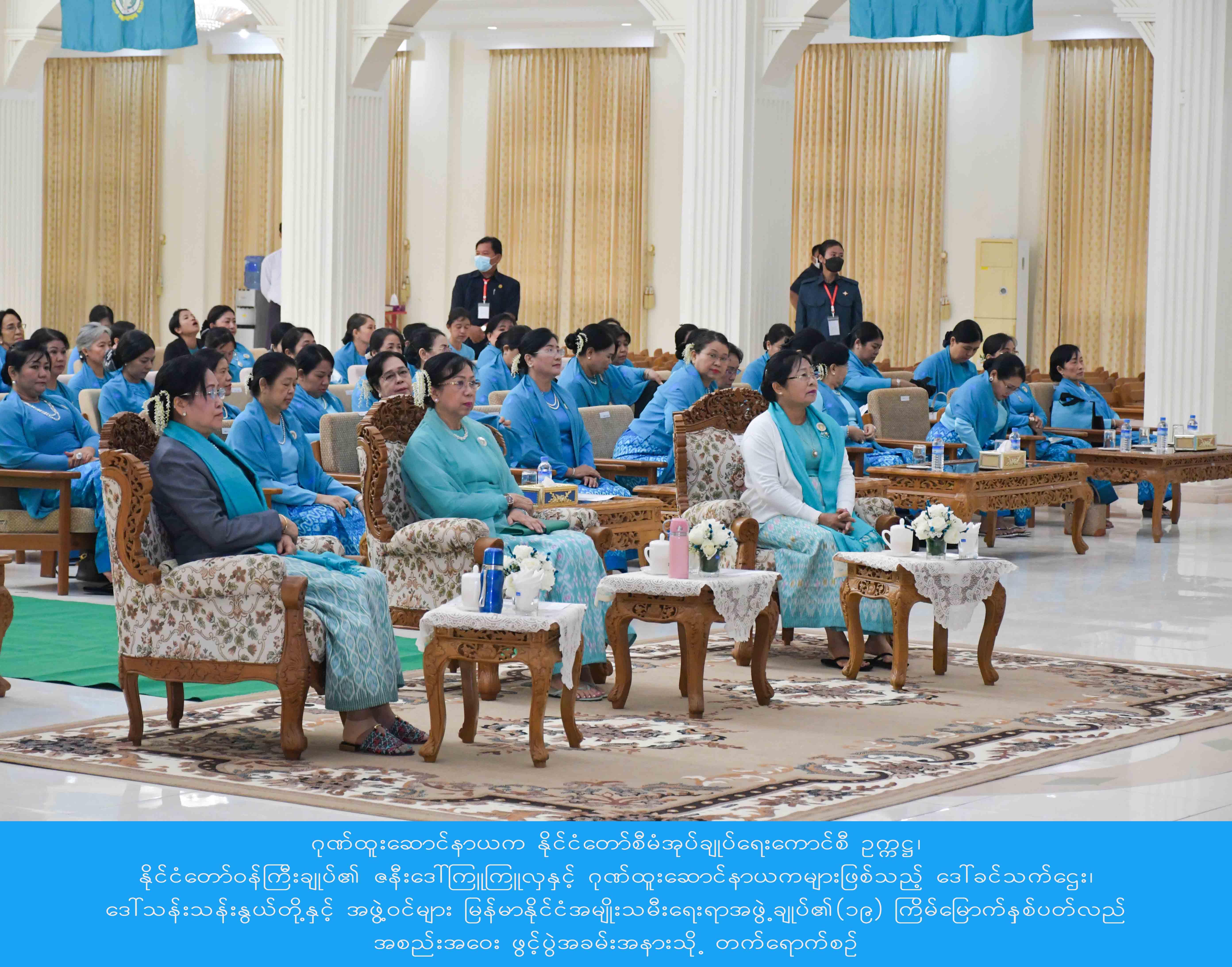 ပြည်ထောင်စုဝန်ကြီး၊ ဒေါက်တာသက်သက်ခိုင်က ၁၉၉၅ ခုနှစ် ဘေဂျင်းကြေညာစာတမ်းအရ အမျိုးသမီးများအား ကဏ္ဍစုံလုပ်ငန်းနယ်ပယ်အသီးသီးမှာ ပါဝင်ခွင့်ရရှိစေဖို့နဲ့ အမျိုးသမီးများရဲ့ စွမ်းဆောင်ရည်မြင့်မားရေး၊ ဖွံ့ဖြိုးတိုးတက်စေရေးတို့အတွက် နိုင်ငံတော်အဆင့် လုပ်ငန်းယန္တရားဖြစ်တဲ့ မြန်မာနိုင်ငံလုံးဆိုင်ရာ အမျိုးသမီးကော်မတီကို ၁၉၉၆ ခုနှစ်၊ ဇူလိုင်လ(၃) ရက်နေ့မှာ ဖွဲ့စည်းခဲ့ပါကြောင်း၊မြန်မာနိုင်ငံ အမျိုးသမီးရေးရာအဖွဲ့ချုပ်အနေနဲ့ မြန်မာနိုင်ငံလုံး ဆိုင်ရာအမျိုးသမီးကော်မတီမှာ အဖွဲ့ဝင်အဖြစ် နေပြည်တော်ကောင်စီ/ တိုင်းဒေသကြီး/ ပြည်နယ်/ ခရိုင်/ မြို့နယ်အသီးသီးမှာ ဖွဲ့စည်းထားတဲ့ အမျိုးသမီးကော်မတီများမှာလည်း တက်ကြွစွာပါဝင်ဆောင်ရွက်လျက်ရှိပြီး မြန်မာနိုင်ငံလုံးဆိုင်ရာ အမျိုးသမီးကော်မတီရဲ့ လုပ်ငန်းယန္တရားကို ပိုမိုအသက်ဝင်စေကာ လုပ်ငန်းတာဝန်များ ထိရောက်ကျယ်ပြန့်စွာ ပူးပေါင်းပါဝင်ဆောင်ရွက်လျက်ရှိပါကြောင်း၊မြန်မာနိုင်ငံလုံးဆိုင်ရာအမျိုးသမီးကော်မတီအနေနဲ့ နိုင်ငံတော်က ဆောင်ရွက်လျက်ရှိတဲ့ ကျား၊မ တန်းတူညီမျှရေးနဲ့ အမျိုးသမီးများ အား ကာကွယ်စောင့်ရှောက်ခြင်းနဲ့ စွမ်းပကားမြှင့်တင်ခြင်းလုပ်ငန်းစဉ်များနဲ့ပတ်သက်ပြီး နိုင်ငံတကာအဆင့် အကောင်အထည်ဖော် ဆောင်ရွက်မှုအနေနဲ့ အမျိုးသမီးများအား နည်းမျိုးစုံဖြင့် ခွဲခြားမှုပပျောက် ရေးဆိုင်ရာ ကုလသမဂ္ဂကွန်ဗင်းရှင်းနဲ့ ၂၀၁၅ ခုနှစ်မှာ ကုလသမဂ္ဂကချမှတ်ခဲ့တဲ့ စဉ်ဆက်မပြတ် ဖွံ့ဖြိုးမှုပန်းတိုင်များ စတဲ့ နိုင်ငံတကာလုပ်ငန်းအစီအစဉ်များကို နိုင်ငံတော်ရဲ့ မူဝါဒနှင့်အညီ အကောင်အထည်ဖော်လျက်ရှိတာဖြစ်ပါကြောင်း၊ ၂၀၂၁ ခုနှစ်၊ဒီဇင်ဘာလ(၁၅)ရက်နေ့မှ (၁၇)ရက်နေ့အထိကျင်းပခဲ့တဲ့ (၁၇)ကြိမ်မြောက်အာဆီယံလူမှုဝန်ထမ်းနှင့်ဖွံ့ဖြိုးတိုးတက်ရေးဆိုင်ရာအဆင့်မြင့်အရာရှိကြီးများအစည်းအဝေးနဲ့ ဆက်စပ်အစည်းအဝေးများကျင်းပစဉ်ကာလအတွင်း ချီးမြှင့်ခဲ့တဲ့အာဆီယံ လူမှုဝန်ထမ်းနှင့်ဖွံ့ဖြိုးတိုးတက်ရေးဆိုင်ရာ ထူးချွန်ဆုကိုမြန်မာနိုင်ငံအမျိုးသမီးရေးရာအဖွဲ့ချုပ်ကအကောင်အထည်ဖော် ဆောင်ရွက်လျက်ရှိတဲ့ ကျေးလက်နေအမျိုးသမီးများဖွံ့ဖြိုးတိုးတက်ရေးစီမံချက်ကထိုက်ထိုက်တန်တန်ရရှိခဲ့တဲ့အတွက် ဂုဏ်ယူဝမ်းမြောက်မိပါကြောင်း၊အမျိုးသမီးများ ဖွံ့ဖြိုးတိုးတက်ရေးဆိုင်ရာ အမျိုးသားအဆင့် မဟာဗျူဟာစီမံကိန်း (၂၀၁၃-၂၀၂၂) (NSPAW) Phase 1 ပါ လုပ်ငန်းစဉ်များဖြစ်တဲ့ အမျိုးသမီးများနဲ့ ပညာရေး၊ ကျန်းမာရေး၊ စီးပွားရေး၊မီဒီယာ၊ သဘာဝပတ်ဝန်းကျင်၊ အမျိုးသမီးများအပေါ်အကြမ်းဖက်မှု၊ အရေးပေါ်အခြေအနေနဲ့ ပဋိပက္ခဒေသအတွင်းရှိအမျိုးသမီးများအတွက်လုပ်ငန်းရပ်များဆောင်