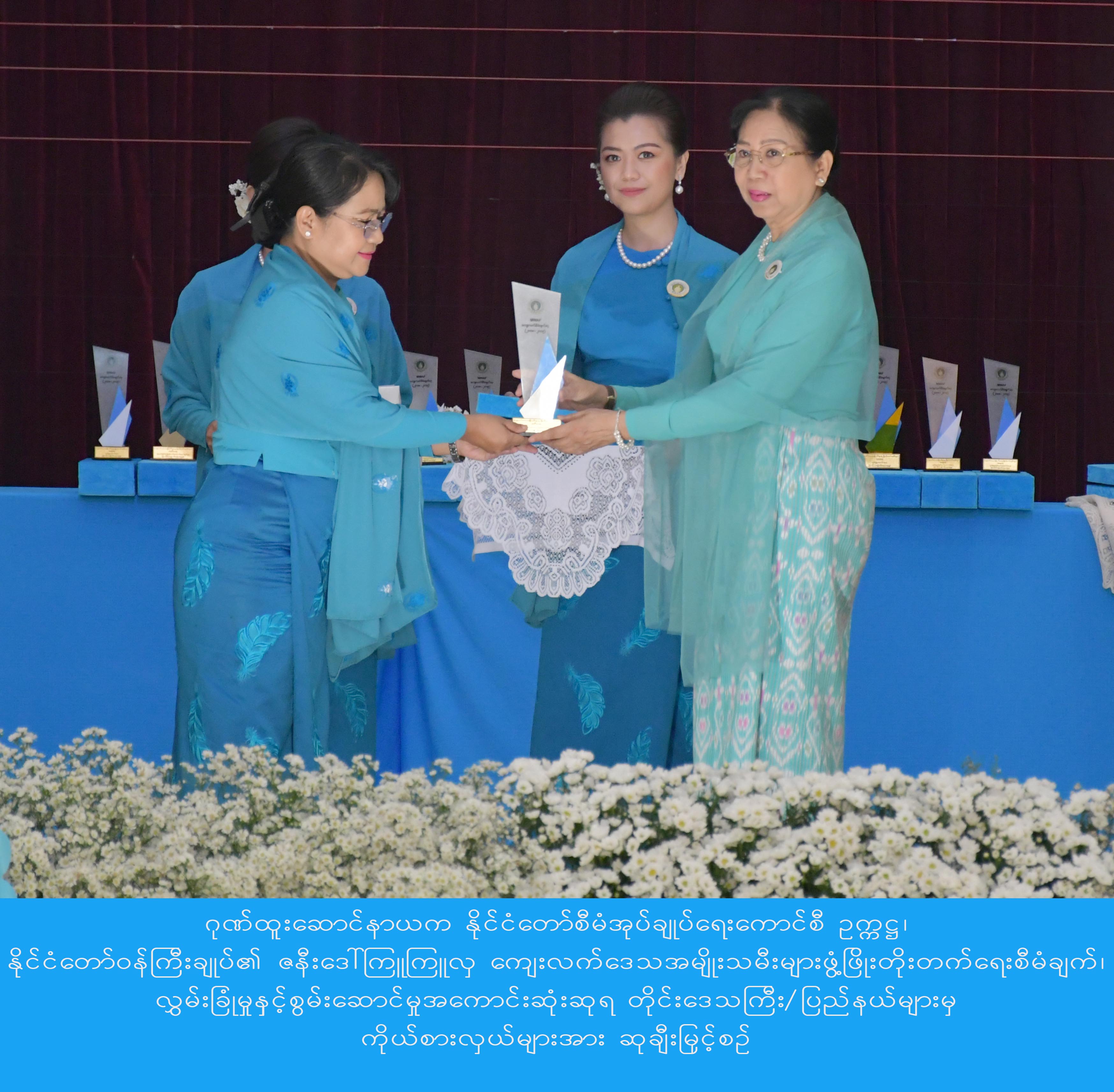 ဆက်လက်၍ ကျေးလက်ဒေသအမျိုးသမီးများဖွံ့ဖြိုးတိုးတက်ရေးစီမံချက်၊ ကျေးရွာများအားဆုချီးမြှင့်ခြင်းအစီအစဉ်ကို ဆက်လက်ပြုလုပ်ခဲ့ရာ ဂုဏ်ထူးဆောင်နာယကဒေါ်ကြူကြူလှကလွှမ်းခြုံမှုနှင့်စွမ်းဆောင်မှုအကောင်းဆုံးဆုတွင် ပထမဆုရရှမ်းပြည်နယ်၊ ဒုတိယဆုရမကွေးတိုင်းဒေသကြီး၊ တတိယဆုရရန်ကုန်တိုင်းဒေသကြီးနှင့်အထူးဆုရ ချင်းပြည်နယ်နှင့်ပဲခူးတိုင်းဒေသကြီးတို့မှ ကိုယ်စားလှယ်များကိုလည်းကောင်း၊ ဂုဏ်ထူးဆောင်နာယကဒေါ်ခင်သက်ဌေးကလွှမ်းခြုံမှုအကောင်းဆုံးဆုတွင်ပထမဆုရကချင်ပြည်နယ်၊ ဒုတိယဆုရစစ်ကိုင်းတိုင်းဒေသကြီး၊တတိယဆုရမွန်ပြည်နယ်နှင့်အထူးဆု ရနေပြည်တော်ကောင်စီနယ်မြေတို့မှကိုယ်စားလှယ်များကိုလည်းကောင်း၊ဂုဏ်ထူးဆောင်နာယကဒေါ်သန်းသန်းနွယ်က စွမ်းဆောင်မှုအကောင်းဆုံးဆုတွင်ပထမဆုရဧရာဝတီတိုင်းဒေသကြီး၊ ဒုတိယဆုရကရင်ပြည်နယ်၊ တတိယဆုရရခိုင်ပြည်နယ်နှင့် အထူးဆုရကယားပြည်နယ်နှင့်တနင်္သာရီတိုင်းဒေသကြီးတို့မှ ကိုယ်စားလှယ်များကိုလည်းကောင်း၊နာယကဒေါ်နီနီဝင်းကစဉ်ဆက် မပြတ်စွမ်းဆောင်မှုအကောင်းဆုံးဆုတွင် ပထမဆုရရန်ကုန်တိုင်းဒေသကြီး၊ ဒုတိယဆုရရှမ်းပြည်နယ်၊ တတိယဆုရမွန်ပြည်နယ်နှင့်အထူးဆုရမန္တလေးတိုင်းဒေသကြီးတို့မှ ကိုယ်စားလှယ်များကိုလည်းကောင်းအသီးသီးပေးအပ်ချီးမြှင့်ခဲ့ကြသည်။