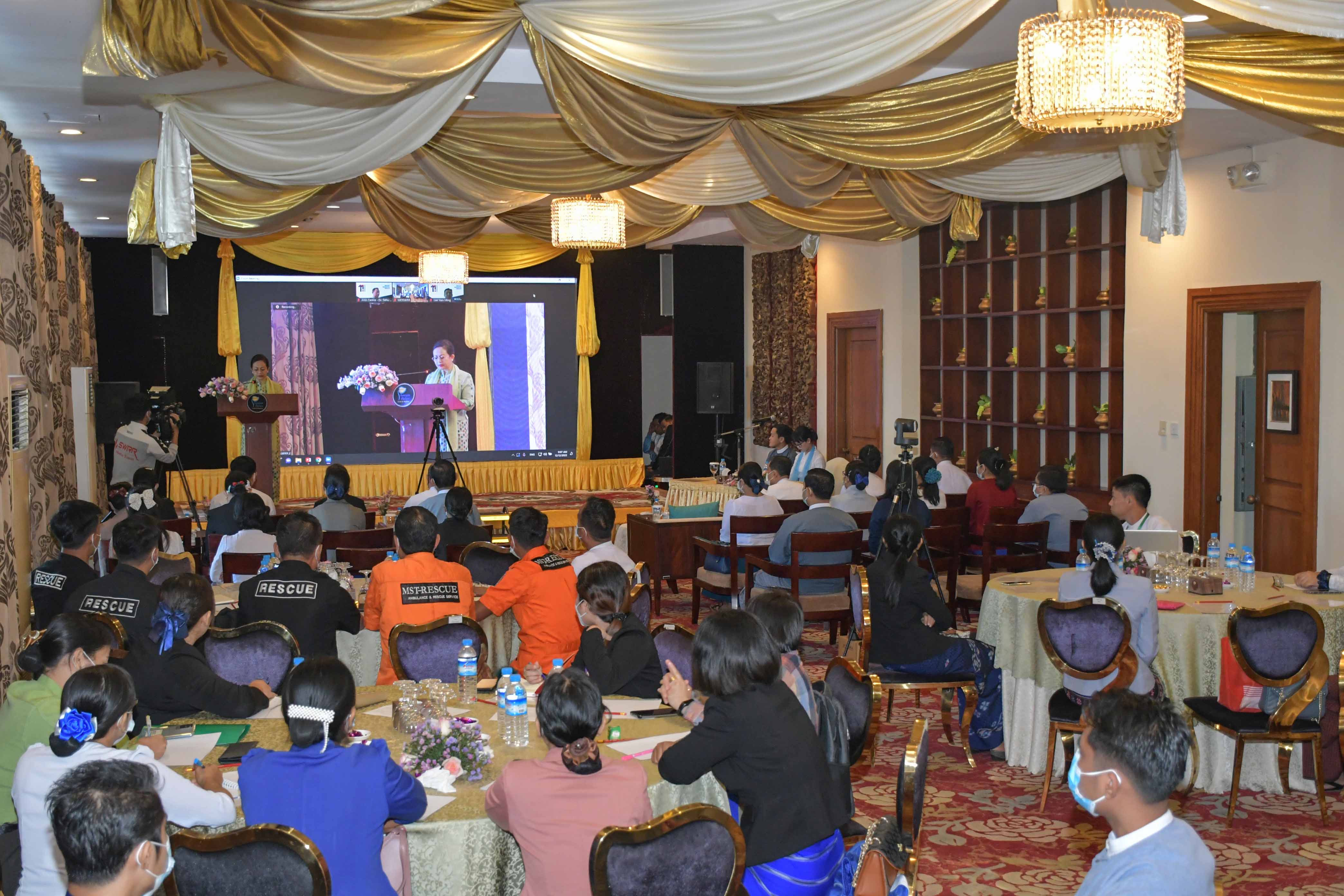 လူမှုဝန်ထမ်း၊ ကယ်ဆယ်ရေးနှင့်ပြန်လည်နေရာချထားရေးဝန်ကြီးဌာန၊ ဘေးအန္တရာယ်ဆိုင်ရာစီမံခန့်ခွဲမှုဦးစီးဌာနမှ ဆောင်ရွက်သည့် မြန်မာဘေးအန္တရာယ်တုံ့ပြန်ရေးအဖွဲ့သင်တန်း၊အမှတ်စဉ်(၃)ဖွင့်ပွဲအခမ်းအနားကို လူမှုဝန်ထမ်း၊ကယ်ဆယ်ရေးနှင့်ပြန်လည်နေရာချထားရေး ဝန်ကြီးဌာန၊ ပြည်ထောင်စုဝန်ကြီး၊ ဒေါက်တာသက်သက်ခိုင်၊ ဒုတိယဝန်ကြီးဦးအောင်ထွန်းခိုင်၊ အမြဲတမ်းအတွင်းဝန်၊ ညွှန်ကြားရေးမှူးချုပ်များ၊ ဒုတိယညွှန်ကြားရေးမှူးချုပ်၊တာဝန်ရှိသူများနှင့်တကွ ဖိတ်ကြားထားသော ဧည့်သည်တော်များ၊ သင်တန်းသားများကနေပြည်တော်ရှိ Aureum Palace Hotel ၌လည်းကောင်း၊ AHA Centre မှ Executive Director Mr. Lee Yam Ming နှင့် တာဝန်ရှိသူများက Online မှ လည်းကောင်းတက်ရောက်ကြပါသည်။